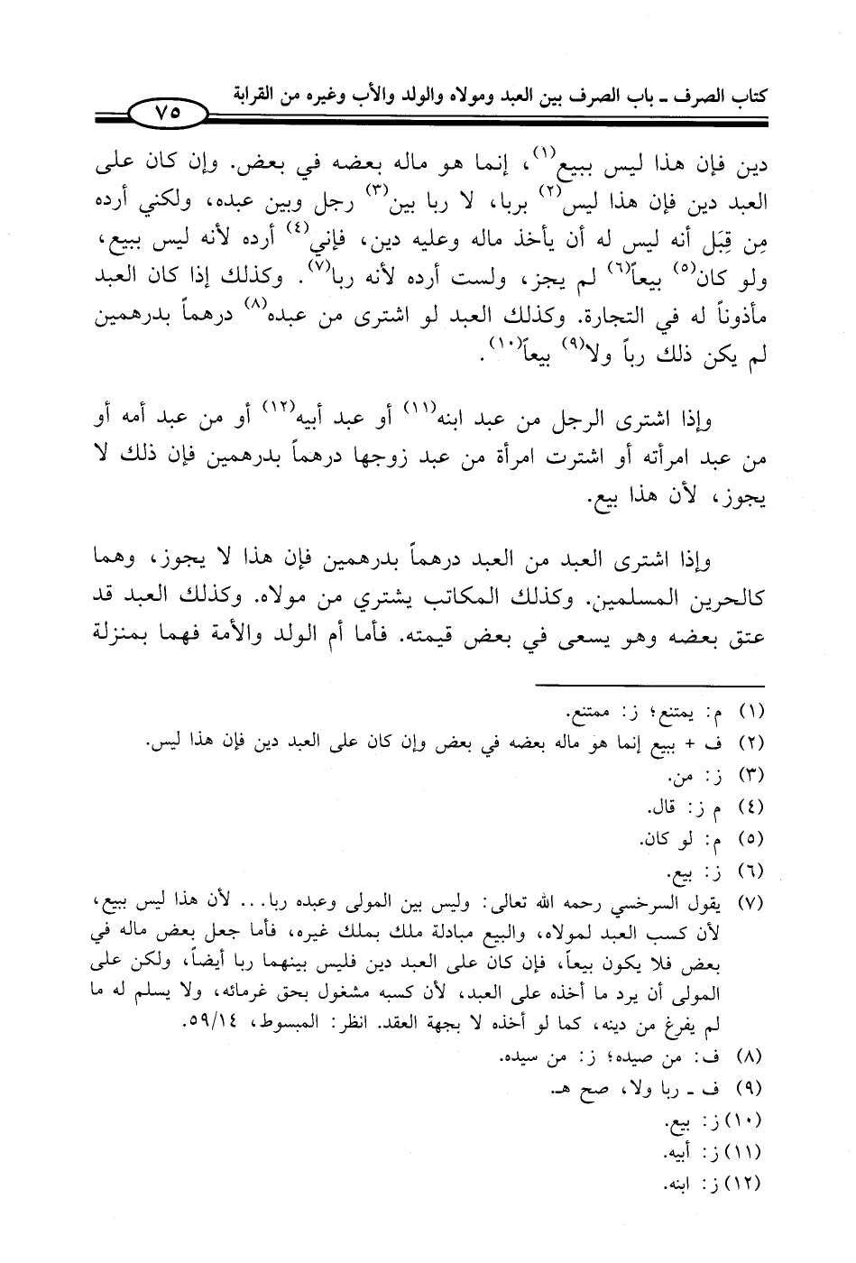 (¬7) يقول السرخسي -رحمه الله تعالى-: وليس بين المولى وعبده ربا ... لأن هذا ليس ببيع، لأن كسب العبد لمولاه، والبيع مبادلة ملك بملك غيره، فأما جعل بعض ماله في بعض فلا يكون بيعاً، فإن كان على العبد دين فليس بينهما ربا أيضاً، ولكن على المولى أن يرد ما أخذه على العبد، لأن كسبه مشغول بحق غرمائه، ولا يسلم له ما لم يفرغ من دينه، كما لو أخذه لا بجهة العقد. انظر: المبسوط، 14/ 59.