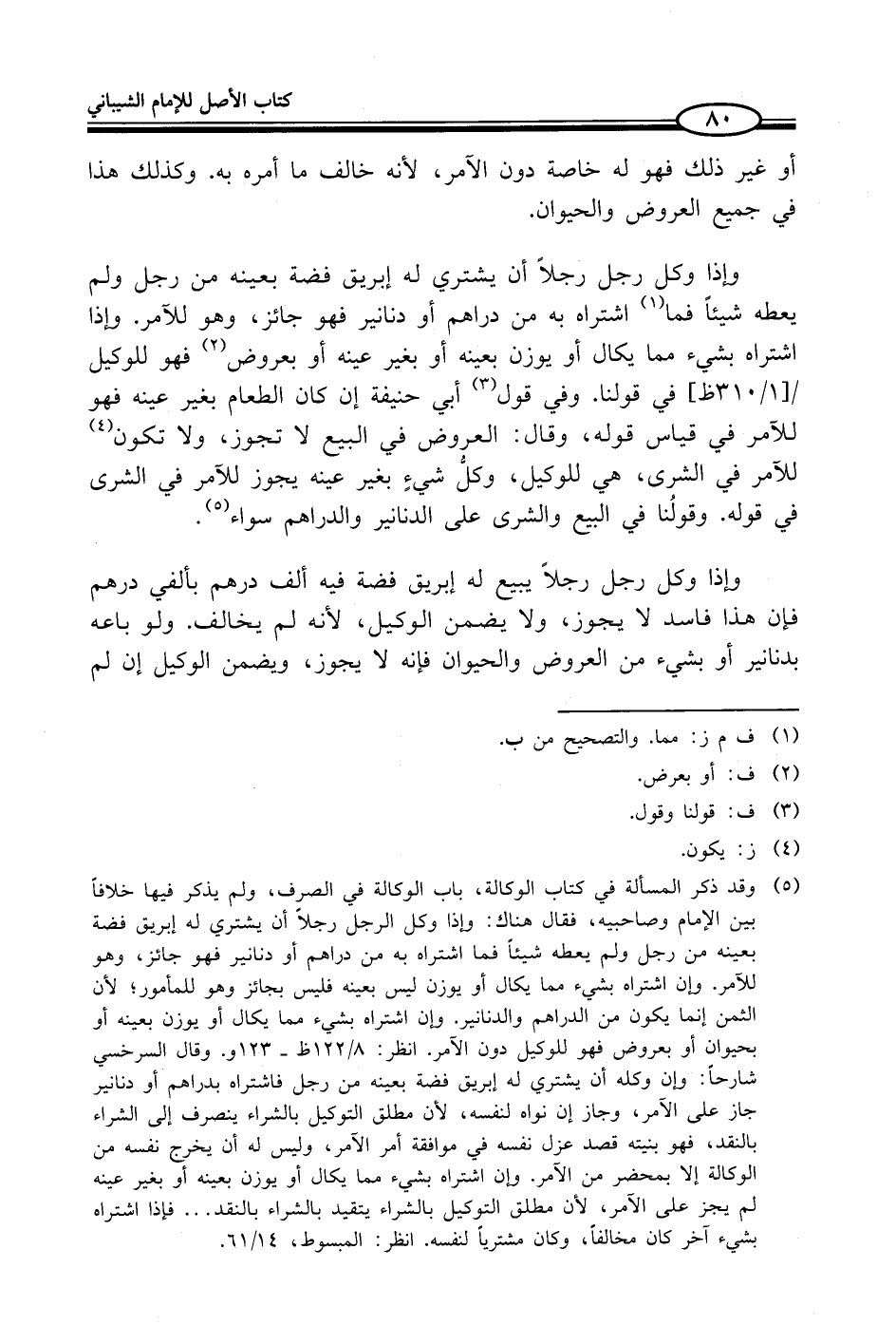 (¬5) وقد ذكر المسألة في كتاب الوكالة، باب الوكالة في الصرف، ولم يذكر فيها خلافاً بين الإمام وصاحبيه، فقال هناك: وإذا وكل الرجل رجلاً أن يشتري له إبريق فضة بعينه من رجل ولم يعطه شيئاً فما اشتراه به من دراهم أو دنانير فهو جائز، وهو للآمر. وإن اشتراه بشيء مما يكال أو يوزن ليس بعينه فليس بجائز وهو للمأمور؛ لأن الثمن إنما يكون من الدراهم والدنانير. وإن اشتراه بشيء مما يكال أو يوزن بعينه أو بحيوان أو بعروض فهو للوكيل دون الآمر. انظر: 8/ 122 ظ - 123 و. وقال السرخسي شارحاً: وإن وكله أن يشتري له إبريق فضة بعينه من رجل فاشتراه بدراهم أو دنانير جاز على الآمر، وجاز إن نواه لنفسه، لأن مطلق التوكيل بالشراء ينصرف إلى الشراء بالنقد، فهو بنيته قصد عزل نفسه في موافقة أمر الآمر، وليس له أن يخرج نفسه من الوكالة إلا بمحضر من الآمر. وإن اشتراه بشيء مما يكال أو يوزن بعينه أو بغير عينه لم يجز على الآمر، لأن مطلق التوكيل بالشراء يتقيد بالشراء بالنقد ... فإذا اشتراه بشيء آخر كان مخالفاً، وكان مشترياً لنفسه. انظر: المبسوط، 14/ 61.