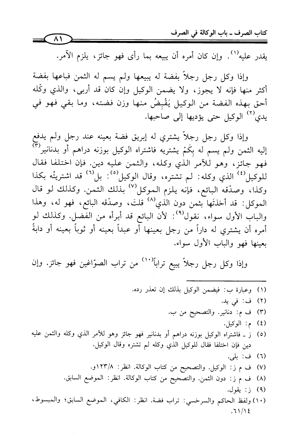 (¬10) ولفظ الحاكم والسرخسي: تراب فضة. انظر: الكافي، الموضع السابق؛ والمبسوط، 14/ 61.