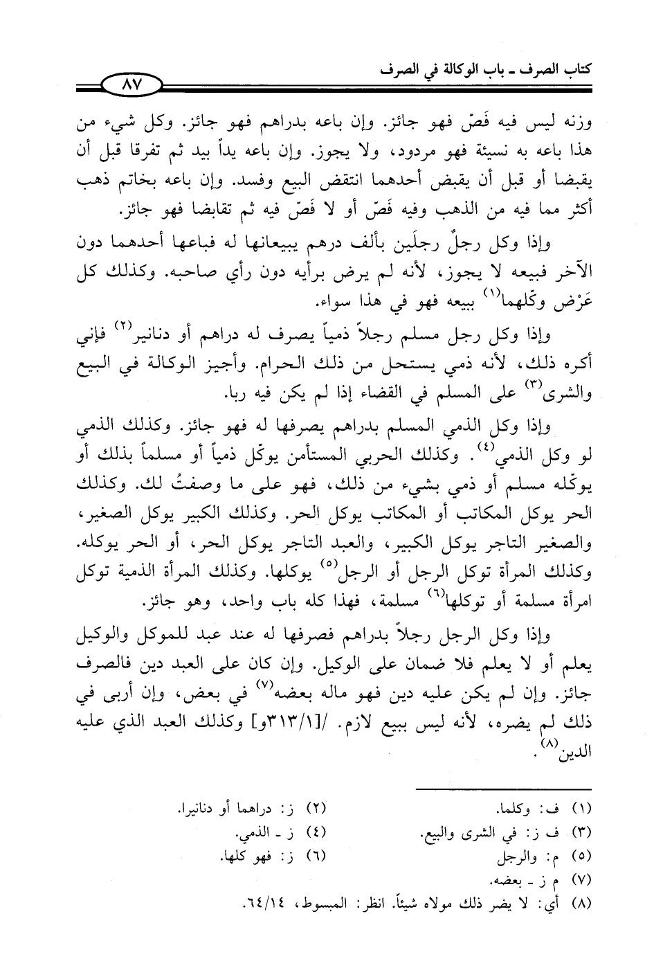 وإذا وكل رجل مسلم رجلاً ذمياً يصرف له دراهم أو دنانير (¬2) فإني أكره ذلك، لأنه ذمي يستحل من ذلك الحرام. وأجيز الوكالة في البيع والشرى (¬3) على المسلم في القضاء إذا لم يكن فيه ربا. وإذا وكل الذمي المسلم بدراهم يصرفها له فهو جائز. وكذلك الذمي لو وكل الذمي (¬4). وكذلك الحربي المستأمن يوكّل ذمياً أو مسلماً بذلك أو يوكّله مسلم أو ذمي بشيء من ذلك، فهو على ما وصفتُ لك. وكذلك الحر يوكل المكاتب أو المكاتب يوكل الحر. وكذلك الكبير يوكل الصغير، والصغير التاجر يوكل الكبير، والعبد التاجر يوكل الحر، أو الحر يوكله. وكذلك المرأة توكل الرجل أو الرجل (¬5) يوكلها. وكذلك المرأة الذمية توكل امرأة مسلمة أو توكلها (¬6) مسلمة، فهذا كله باب واحد، وهو جائز.