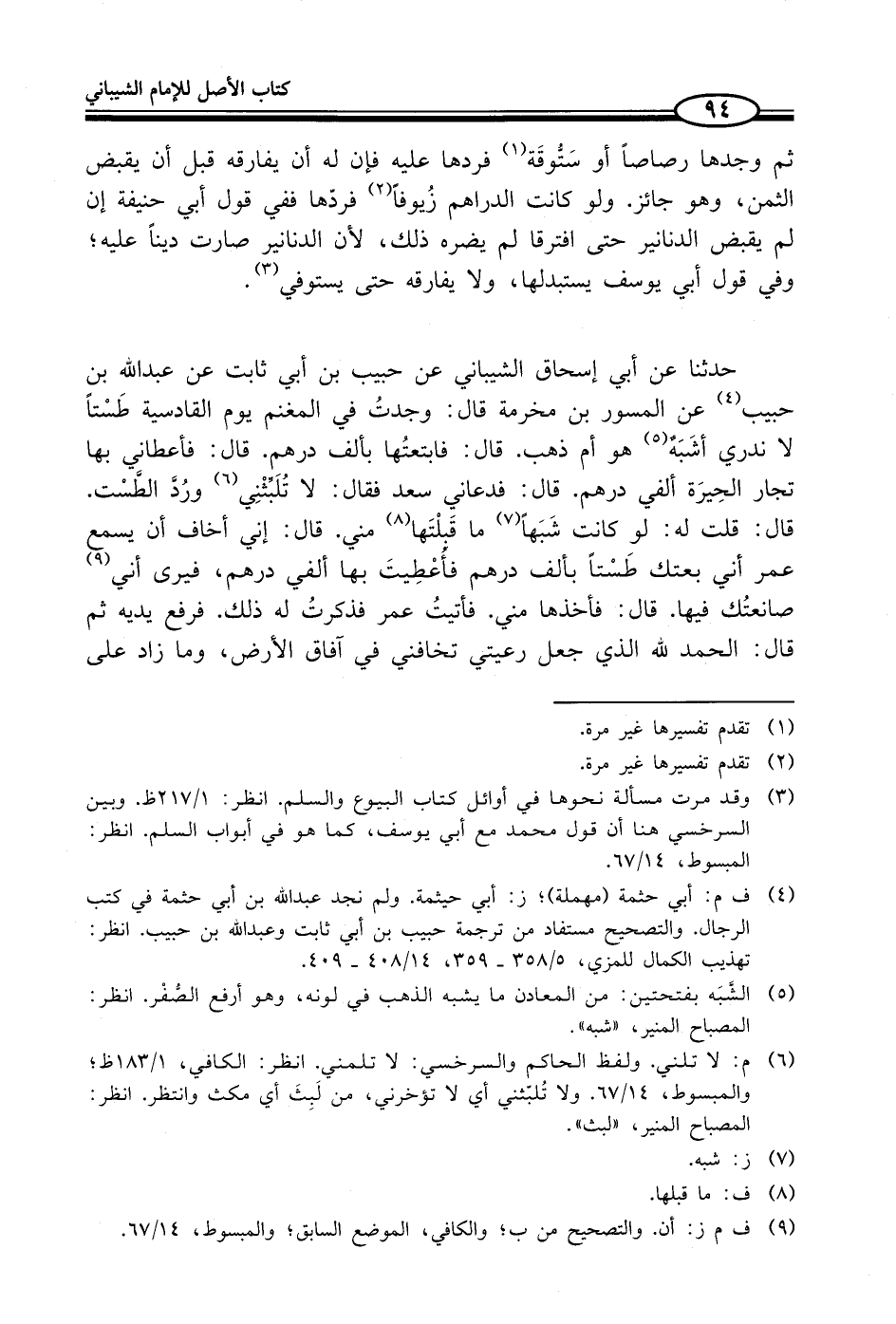 (¬3) وقد مرت مسألة نحوها في أوائل كتاب البيوع والسلم. انظر: 1/ 217 ظ. وبين السرخسي هنا أن قول محمد مع أبي يوسف، كما هو في أبواب السلم. انظر: المبسوط، 14/ 67.