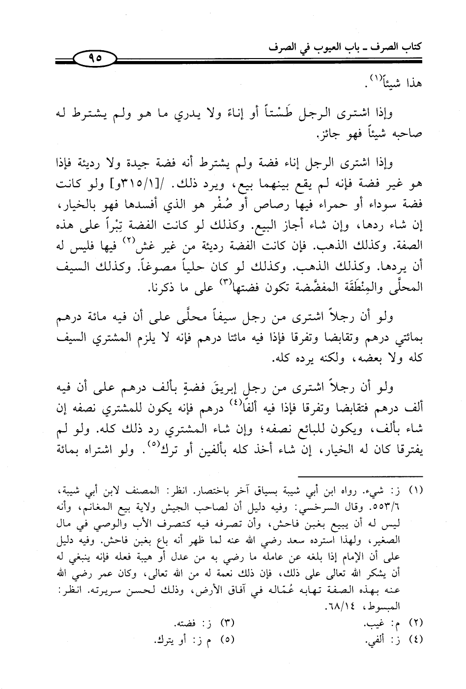 وإذا اشترى الرجل إناء فضة ولم يشترط أنه فضة جيدة ولا رديئة فإذا هو غير فضة فإنه لم يقع بينهما بيع، ويرد ذلك. ولو كانت فضة سوداء أو حمراء فيها رصاص أو صُفْر هو الذي أفسدها فهو بالخيار، إن شاء ردها، وإن شاء أجاز البيع. وكذلك لو كانت الفضة تِبْرأ على هذه الصفة. وكذلك الذهب. فإن كانت الفضة رديئة من غير غش (¬2) فيها فليس له أن يردها. وكذلك الذهب. وكذلك لو كان حلياً مصوغاً. وكذلك السيف المحلَّى والمِنْطَقَة المفضَّضة تكون فضتها (¬3) على ما ذكرنا.