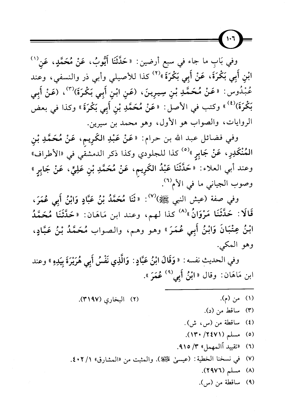 وفي بَابِ ما جاء في سبع أرضين: "حَدَّثنَا أَيُّوبُ، عَنْ مُحَمَّدٍ، عَنِ (¬1) ابْنِ أَبِي بَكْرَةَ، عَنْ أَبِي بَكْرَة" (¬2) كذا للأصيلي وأبي ذر والنسفي، وعند عُبْدُوس: "عَنْ مُحَمَّدِ بْنِ سِيرِينَ، (عَنِ ابْنِ أَبِي بَكْرَةَ) (¬3)، (عَنْ أَبِي بَكْرَةَ" (¬4) " وكتب في الأصل:"عَنْ مُحَمَّدِ بْنِ أَبِي بَكْرَة" وكذا في بعض الروايات، والصواب هو الأول، وهو محمَّد بن سيرين.