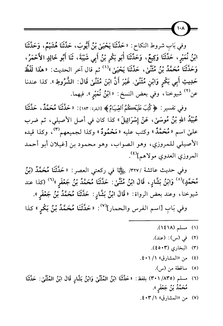 وفي بَابِ شروط النكاح: "حَدَّثنَا يَحْيَى بْنُ أَيُّوبَ، حَدَّثنَا هُشَيْمٌ، وَحَدَّثنَا ابْنُ نُمَيْرٍ، حَدَّثنَا وكيعٌ، وَحَدَّثنَا أبَو بَكْرِ بْنُ أَبِي شَيْبَةَ، ثنَا أَبُو خَالِدٍ الأحْمَرُ، وَحَدَّثنَا مُحَمَّدُ بْنُ مُثنَى، حَدَّثنَا يَحْيَى" (¬1) ثم قال آخر الحديث: "هذا لَفْظُ حَدِيثِ أَبِي بَكْرٍ وَابْنِ مُثَنَّى. غَيْرَ أَنَّ ابْنَ مُثَنَّى قَالَ: الشُّرُوطِ". كذا عندنا عن (¬2) شيوخنا، وفي بعض النسخ: "ابْنُ نُمَيْرٍ". فيهما.