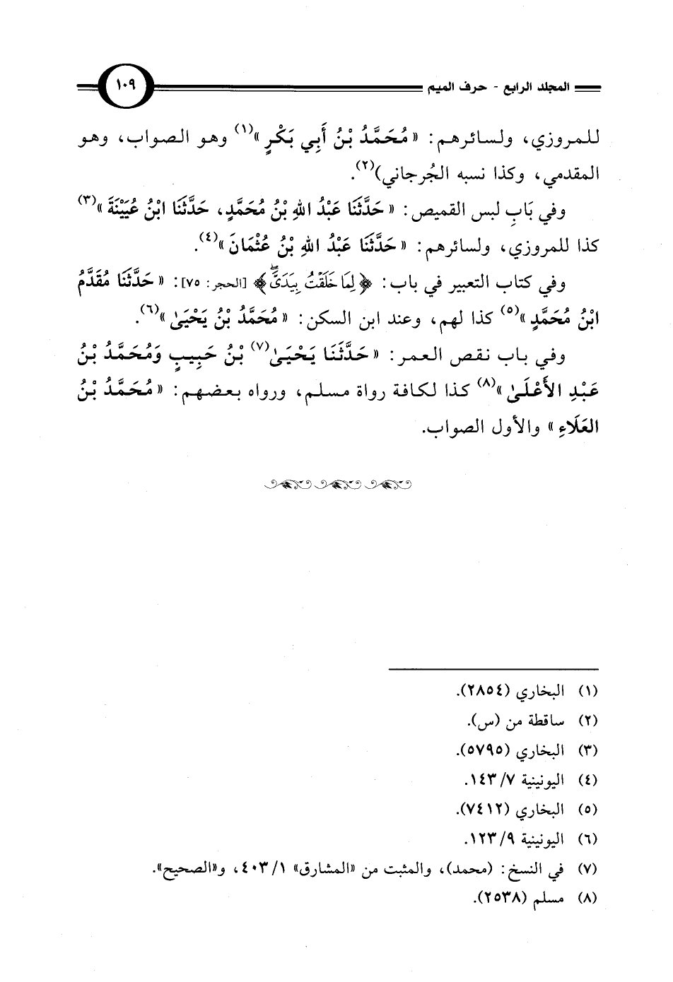 للمروزي، ولسائرهم: "مُحَمَّدُ بْنُ أَبِي بَكْرٍ" (¬1) وهو الصواب، وهو المقدمي، وكذا نسبه الجُرجاني) (¬2).