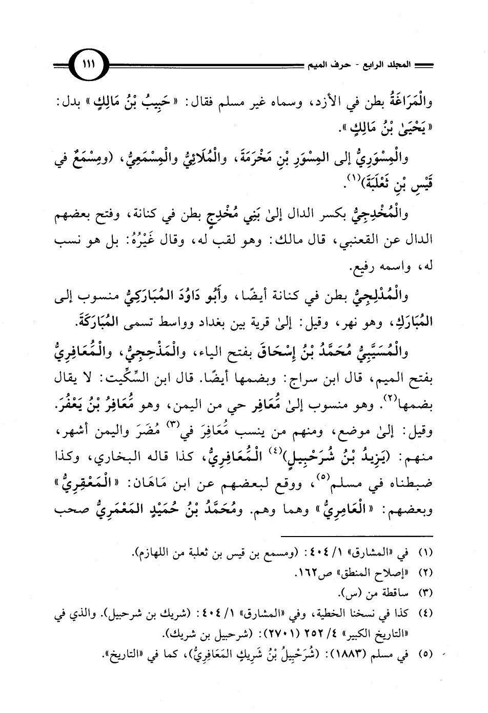 والْمُدْلِجِيُّ بطن في كنانة أيضًا، وأَبُو دَاوُدَ المُبَارَكِيُّ منسوب إلى المُبَارَكِ، وهو نهر، وقيل: إلى قرية بين بغداد وواسط تسمى المُبَارَكَةَ.