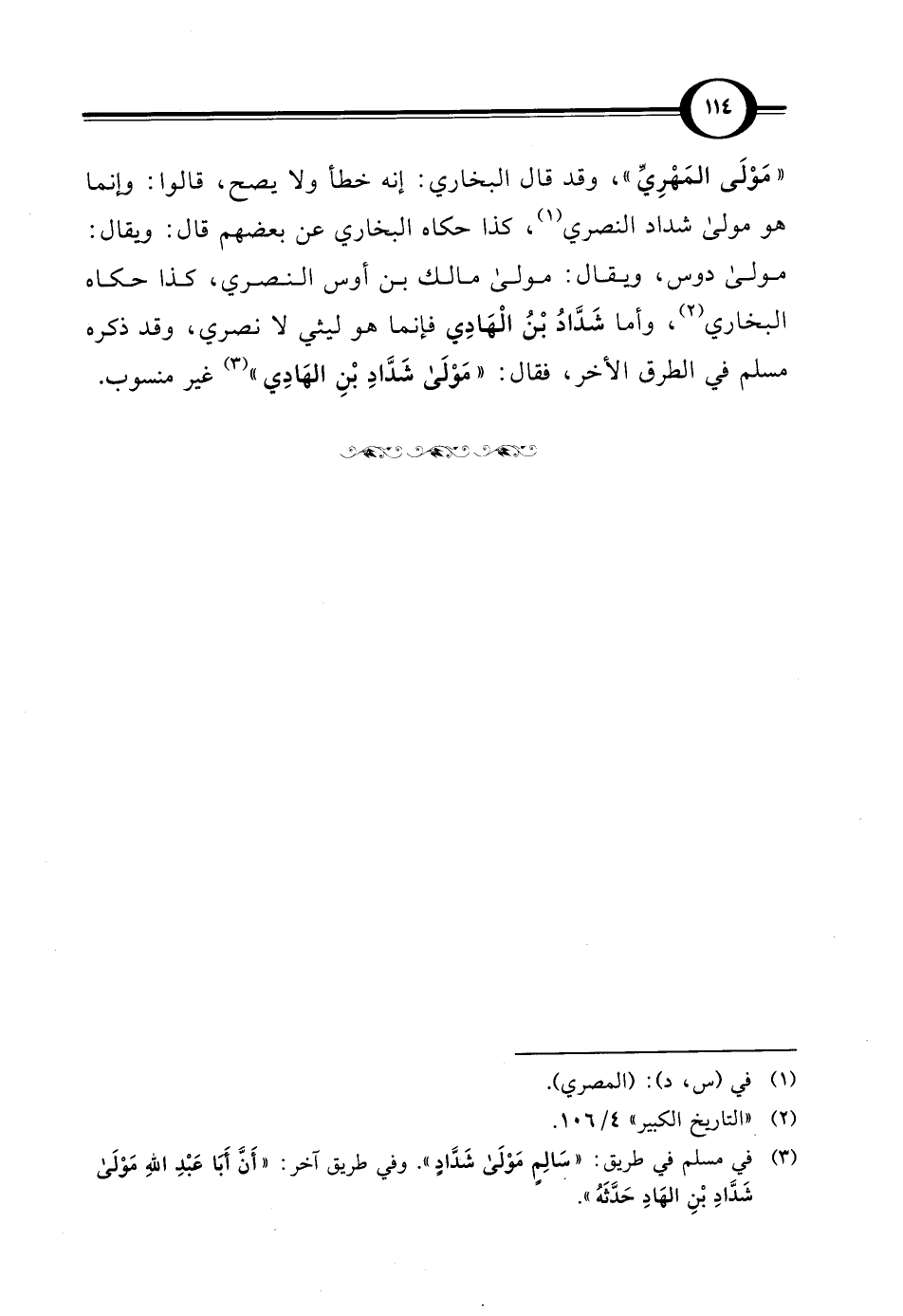 "مَوْلَى المَهْرِيَّ"، وقد قال البخاري: إنه خطأ ولا يصح، قالوا: وإنما هو مولى شداد النصري (¬1)، كذا حكاه البخاري عن بعضهم قال: ويقال: مولى دوس، ويقال: مولى مالك بن أوس النصري، كذا حكاه البخاري (¬2)، وأما شَدَّادُ بْنُ الْهَادِي فإنما هو ليثي لا نصري، وقد ذكره مسلم في الطرق الأخر، فقال: "مَوْلَى شَدَّادِ بْنِ الهَادِي" (¬3) غير منسوب.