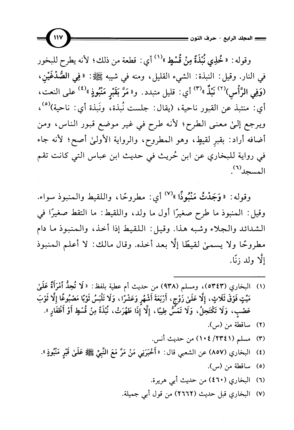 وقوله: "خُذِي نُبْذَةً مِنْ قُسْطٍ" (¬1) أي: قطعة من ذلك؛ لأنه يطرح للبخور في النار. وقيل: النبذة: الشيء القليل، ومنه في شيبة - صلى الله عليه وسلم -: "في الصُّدْغَيْنِ، (وَفِي الرَّأْسِ) (¬2) نَبْذٌ" (¬3) أي: قليل متبدد. و"مَرَّ بَقَبْرٍ مَنْبُوذٍ" (¬4) على النعت، أي: منتبذ عن القبور ناحية، (يقال: جلست نُبذة، ونَبذة أي: ناحية) (¬5)، ويرجع إلى معنى الطرح؛ لأنه طرح في غير موضع قبور الناس، ومن أضافه أراد: بقبرِ لقيطٍ، وهو المطروح، والرواية الأولى أصح؛ لأنه جاء في رواية للبخاري عن ابن حُريث في حديث ابن عباس التي كانت تقم المسجد (¬6).