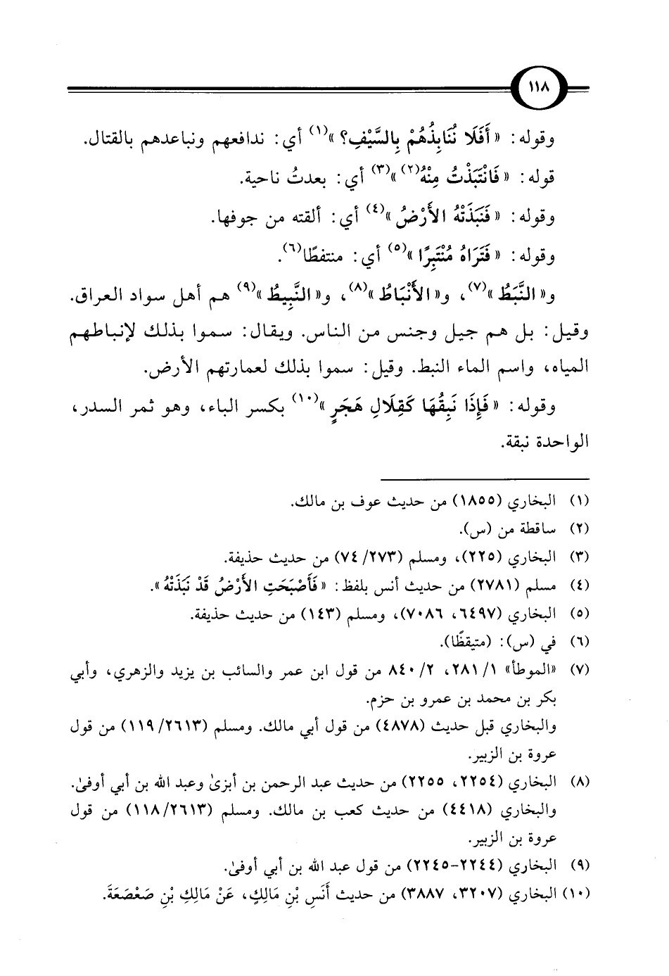 (¬7) "الموطأ" 1/ 281، 2/ 840 من قول ابن عمر والسائب بن يزيد والزهري، وأبي بكر بن محمَّد بن عمرو بن حزم. والبخاري قبل حديث (4878) من قول أبي مالك. ومسلم (2613/ 119) من قول عروة بن الزبير.