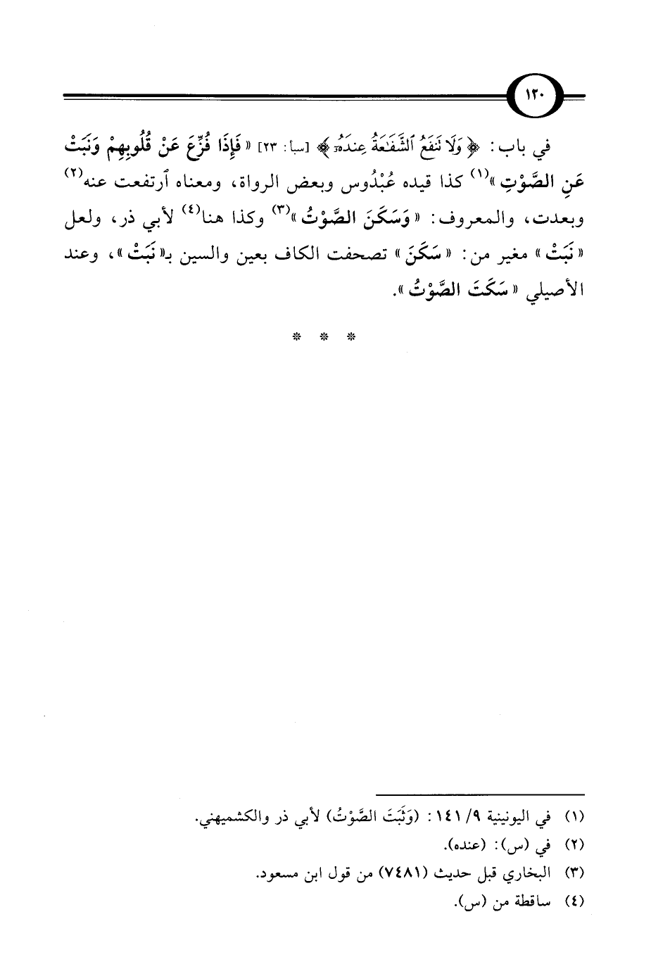 في باب: {وَلَا تَنْفَعُ الشَّفَاعَةُ عِنْدَهُ} [سبأ: 23] "فَإِذَا فُزِّعَ عَنْ قُلُوبِهِمْ وَنبتْ عَنِ الصَّوْتِ" (¬1) كذا قيده عُبْدُوس وبعض الرواة، ومعناه ارتفعت عنه (¬2) وبعدت، والمعروف: "وَسَكَنَ الصَّوْتُ" (¬3) وكذا هنا (¬4) لأبي ذر، ولعل "نَبَتْ" مغير من: "سَكَنَ" تصحفت الكاف بعين والسين بـ "نَبَتْ"، وعند الأصيلي "سَكَتَ الصَّوْتُ".