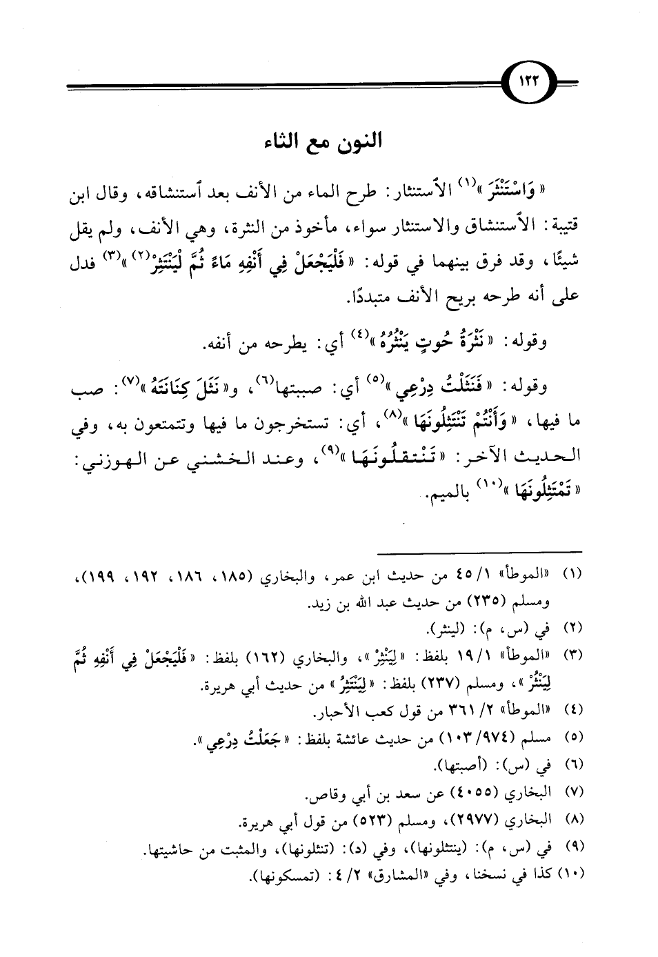 (¬3) "الموطأ" 1/ 19 بلفظ: "لِيَنْثِرْ"، والبخاري (162) بلفظ: "فَلْيَجْعَلْ في أَنْفِهِ ثُمَّ لِيَنْثُرْ"، ومسلم (237) بلفظ: "ليَنْتَثِرُ" من حديث أبى هريرة.