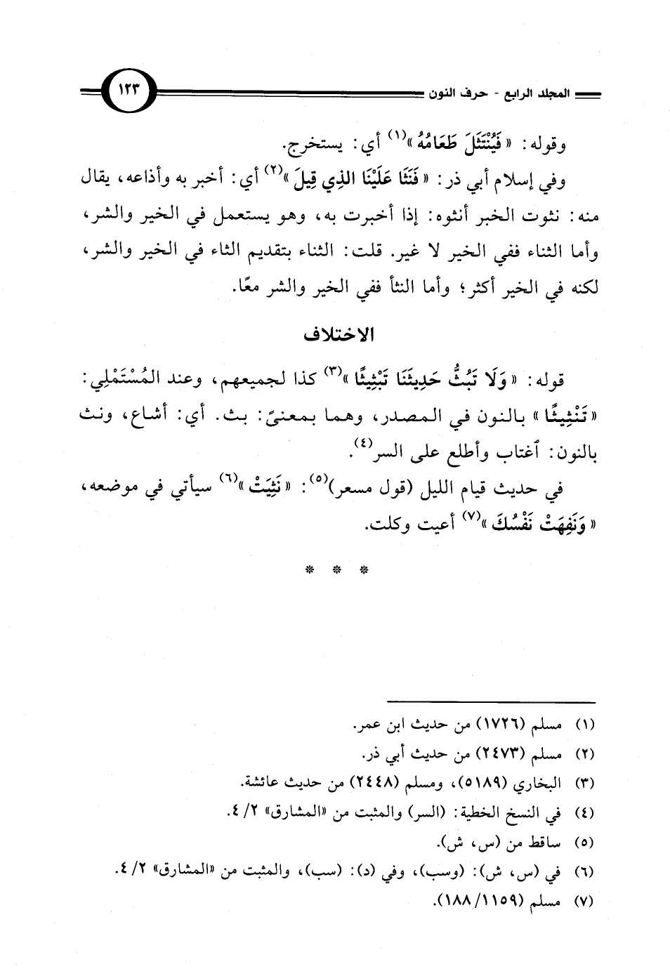 وفي إسلام أبي ذر: "فَنَثَا عَلَيْنَا الذِي قِيلَ" (¬2) أي: أخبر به وأذاعه، يقال منه: نثوت الخبر أنثوه: إذا أخبرت به، وهو يستعمل في الخير والشر، وأما الثناء ففي الخير لا غير. قلت: الثناء بتقديم الثاء في الخير والشر، لكنه في الخير أكثر؛ وأما النثأ ففي الخير والشر معًا.
