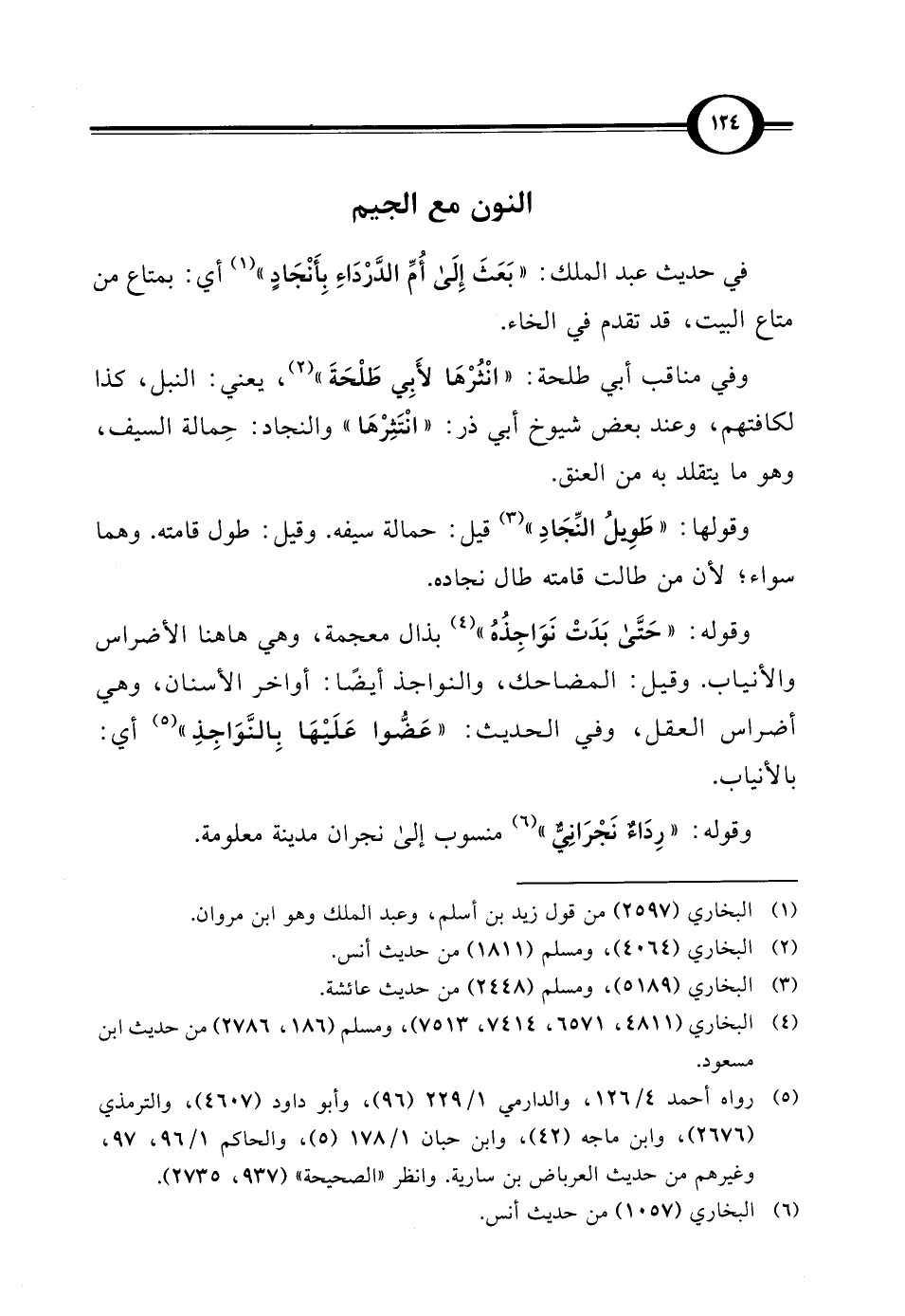 وفي مناقب أبي طلحة: "انْثُرْهَا لأَبِي طَلْحَةَ" (¬2)، يعني: النبل، كذا لكافتهم، وعند بعض شيوخ أبي ذر: "انْتَثِرْهَا" والنجاد: حِمالة السيف، وهو ما يتقلد به من العنق.