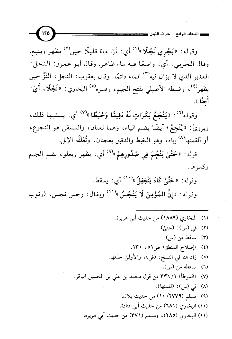 وقال الحربي: أي: واسعًا فيه ماء ظاهر. وقال أبو عمرو: النجل: الغدير الذي لا يزال فيه (¬3) الماء دائمًا. وقال يعقوب: النجل: النَّزُّ حين يظهر (¬4)، وضبطه الأصيلي بفتح الجيم، وفسره (¬5) البخاري: "نَجْلاً، أَيْ: آَجِنًا".