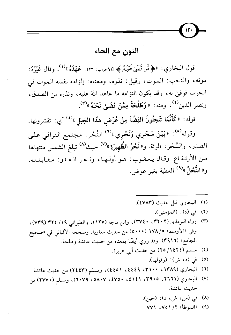 قول البخاري: " {قَضَى نَحْبَهُ} [الأحزاب: 23]: عَهْدَهُ" (¬1). وقال غَيْرُهُ: موته، والنحب: الموت، وقيل: نذره، ومعناه: إلزامه نفسه الموت في الحرب فوفى به، وقد يكون التزامه ما عاهد الله عليه، ونذره من الصدق، ونصر الدين (¬2)، ومنه: "وَطَلْحَةُ مِمَّنْ قَضَى نَحْبَهُ" (¬3).