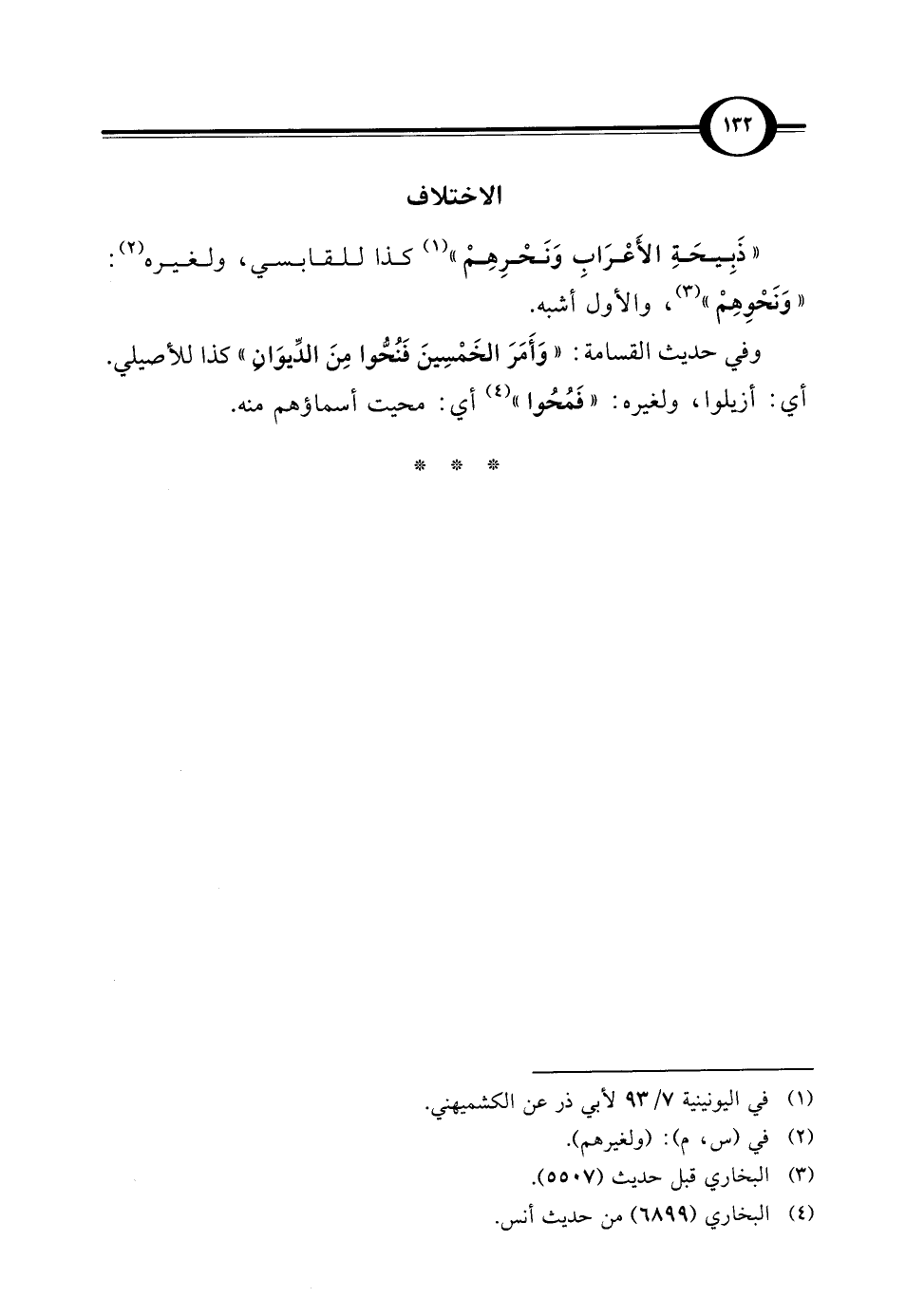 " ذَبِيحَةِ الأَعْرَابِ وَنَحْرِهِمْ" (¬1) كذا للقابسي، ولغيره (¬2): " وَنَحْوِهِمْ " (¬3)، والأول أشبه.