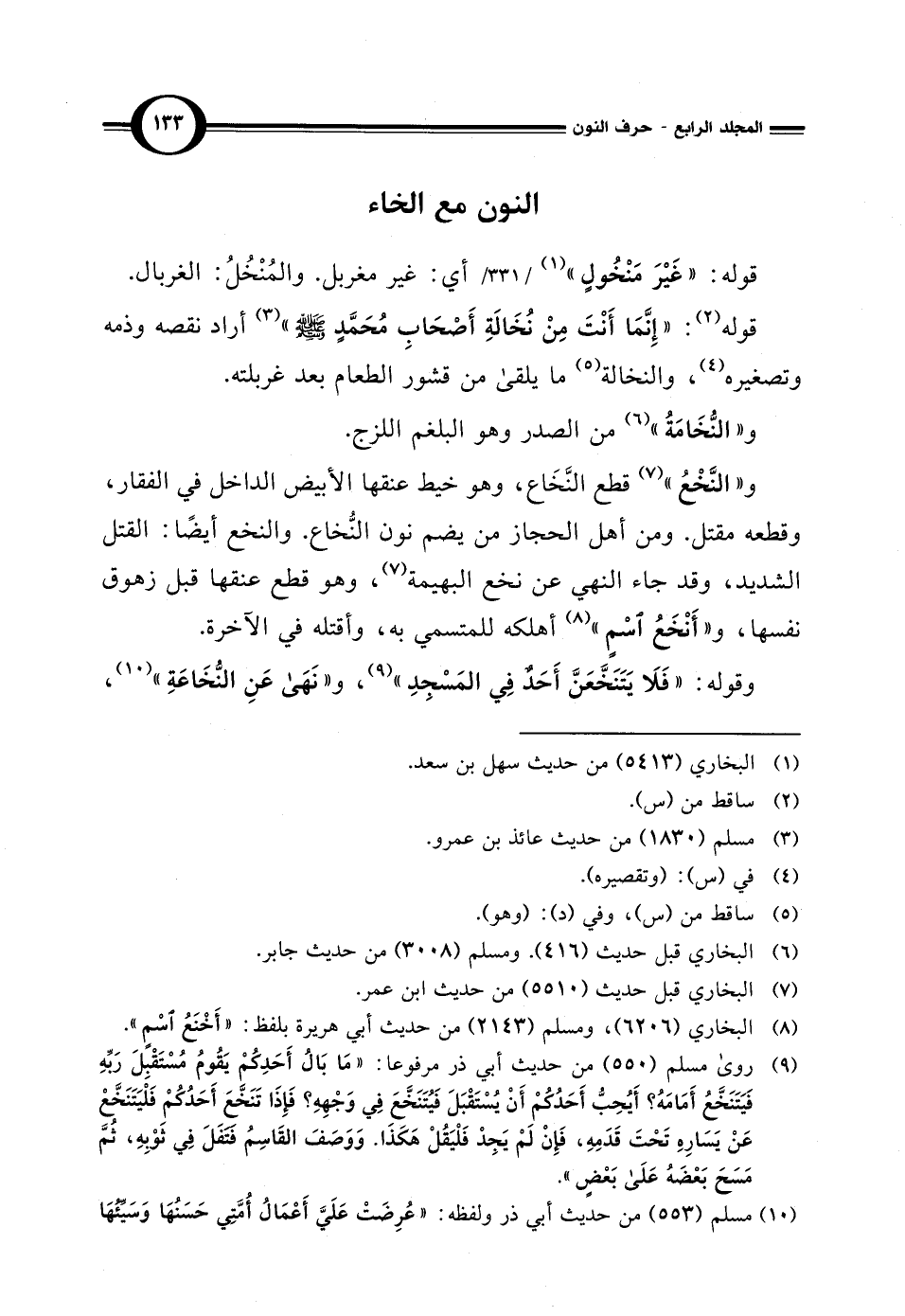 و"النَّخْعُ" (¬7) قطع النَّخَاع، وهو خيط عنقها الأبيض الداخل في الفقار، وقطعه مقتل. ومن أهل الحجاز من يضم نون النُّخاع. والنخع أيضًا: القتل الشديد، وقد جاء النهي عن نخع البهيمة (7)، وهو قطع عنقها قبل زهوق نفسها، و "أَنْخَعُ اسْمٍ" (¬8) أهلكه للمتسمي به، وأقتله في الآخرة.