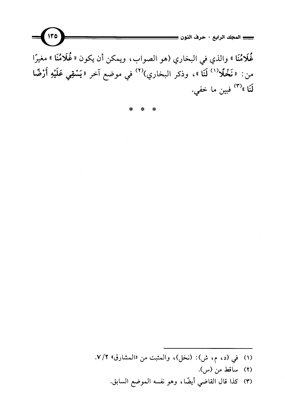 غُلَامُنَا" والذي في البخاري (هو الصواب، ويمكن أن يكون "غُلَامُنَا"، مغيرًا من: "نَخْلًا (¬1) لنا"، وذكر البخاري) (¬2) في موضع آخر "يَسْقِي عَلَيْهِ أَرْضًا لنا" (¬3) فبين ماخفي.