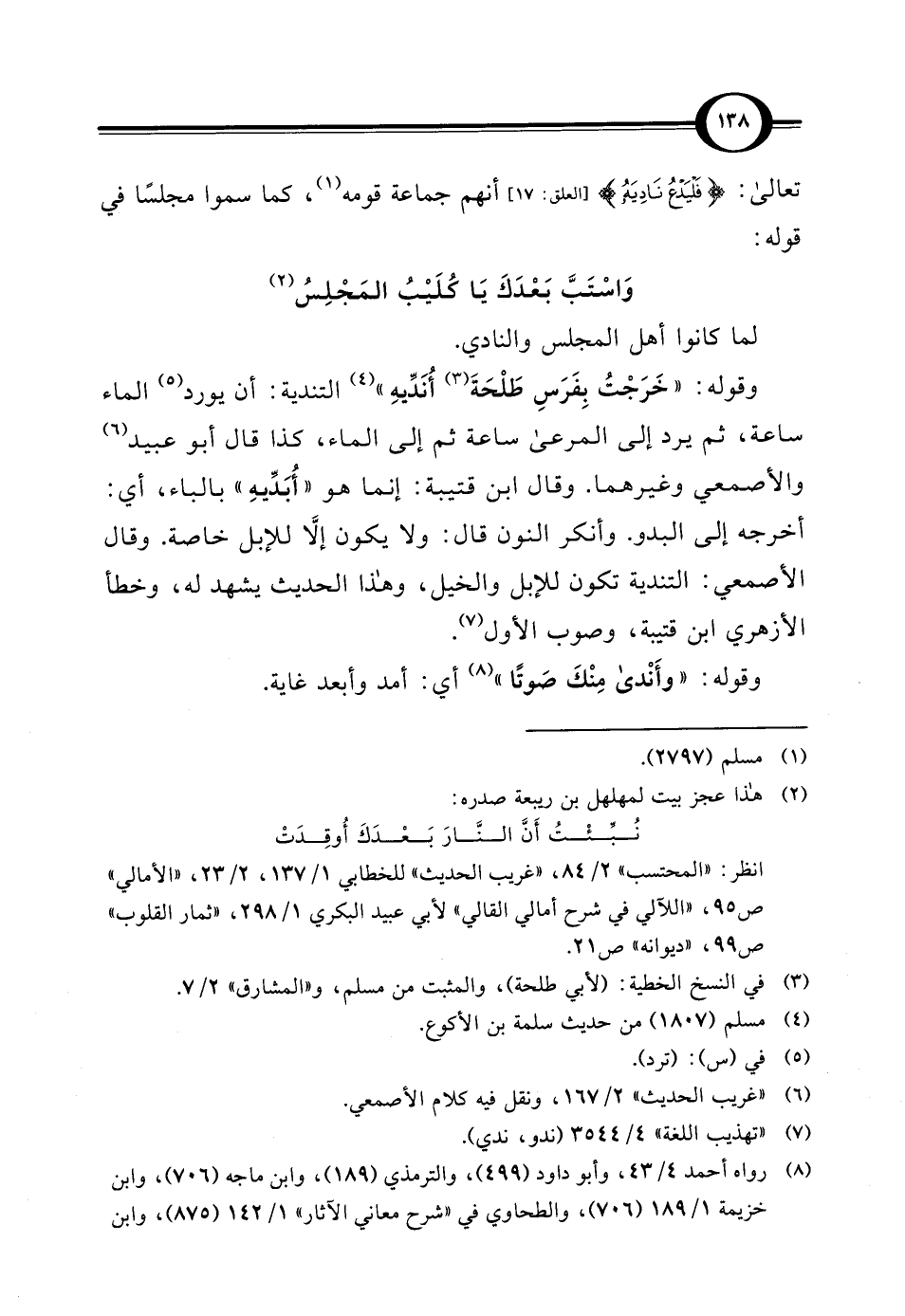 وقوله: "خَرَجْتُ بِفَرَسِ طَلْحَةَ (¬3) أُنَدِّيهِ" (¬4) التندية: أن يورد (¬5) الماء ساعة، ثم يرد إلى المرعى ساعة ثم إلى الماء، كذا قال أبو عبيد (¬6) والأصمعي وغيرهما. وقال ابن قتيبة: إنما هو"أُبَدِّيهِ" بالباء، أي: أخرجه إلى البدو. وأنكر النون قال: ولا يكون إلَّا للإبل خاصة. وقال الأصمعي: التندية تكون للإبل والخيل، وهذا الحديث يشهد له، وخطأ الأزهري ابن قتيبة، وصوب الأول (¬7).