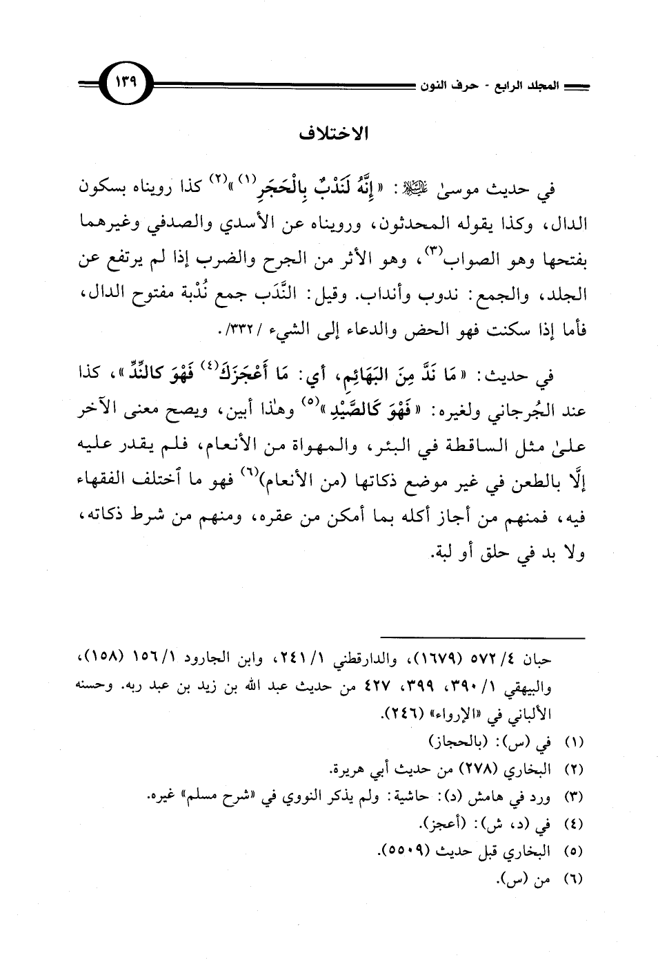 في حديث: "مَا نَدَّ مِنَ البَهَائِمِ، أي: مَا أَعْجَزَكَ (¬4) فَهْوَ كالنِّدِّ "، كذا عند الجُرجاني ولغيره: "فَهْوَ كَالصَّيْدِ" (¬5) وهذا أبين، ويصح معنى الآخر على مثل الساقطة في البئر، والمهواة من الأنعام، فلم يقدر عليه إلاَّ بالطعن في غير موضع ذكاتها (من الأنعام) (¬6) فهو ما اختلف الفقهاء فيه، فمنهم من أجاز أكله بما أمكن من عقره، ومنهم من شرط ذكاته، ولابد في حلق أو لبة.