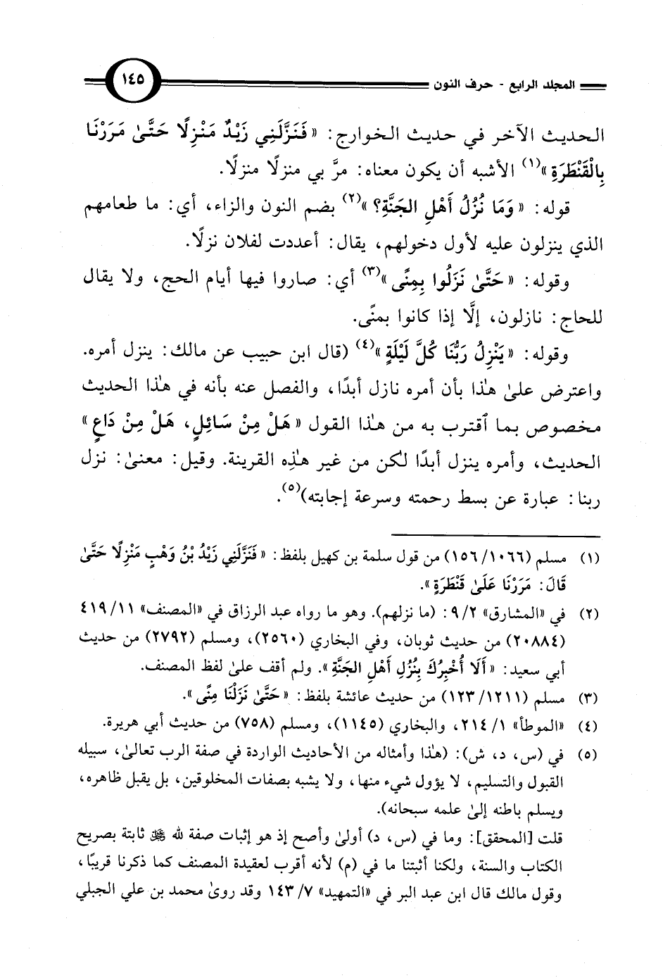 (¬5) في (س، د، ش): (هذا وأمثاله من الأحاديث الواردة في صفة الرب تعالى، سبيله القبول والتسليم، لا يؤول شيء منها، ولا يشبه بصفات المخلوقين، بل يقبل ظاهره، ويسلم باطنه إلى علمه سبحانه). قلت [المحقق]،: وما في (س، د) أولى وأصح إذ هو إثبات صفة لله عزوجل ثابتة بصريح الكتاب والسنة، ولكنا أثبتنا ما في (م) لأنه أقرب لعقيدة المصنف كما ذكرنا قريبًا، وقول مالك قال ابن عبد البر في "التمهيد" 7/ 143 وقد روى محمَّد بن علي الجبلي