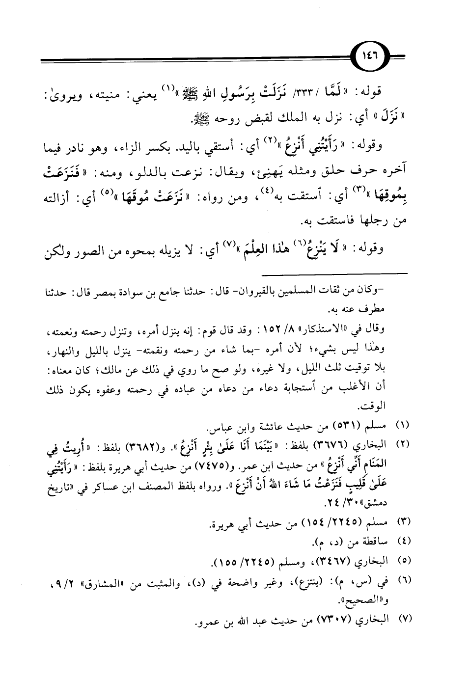 قوله: "لَمَّا نَزَلَتْ بِرَسُولِ اللهِ - صلى الله عليه وسلم -" (¬1) يعني: منيته، ويروى: " نَزَلَ " أي: نزل به الملك لقبض روحه - صلى الله عليه وسلم - وقوله. "رَأَيْتُنِي أَنْزعُ" (¬2) أي: أستقي باليد. بكسر الزاء، وهو نادر فيما آخره حرف حلق ومثله يَهنِئ، ويقال: نزعت بالدلو، ومنه: "فَنَزَعَتْ بِمُوقِهَا" (¬3) أي: استقت به (¬4)، ومن رواه: "نَزَعَتْ مُوقَهَا" (¬5) أي: أزالته من رجلها فاستقت به.