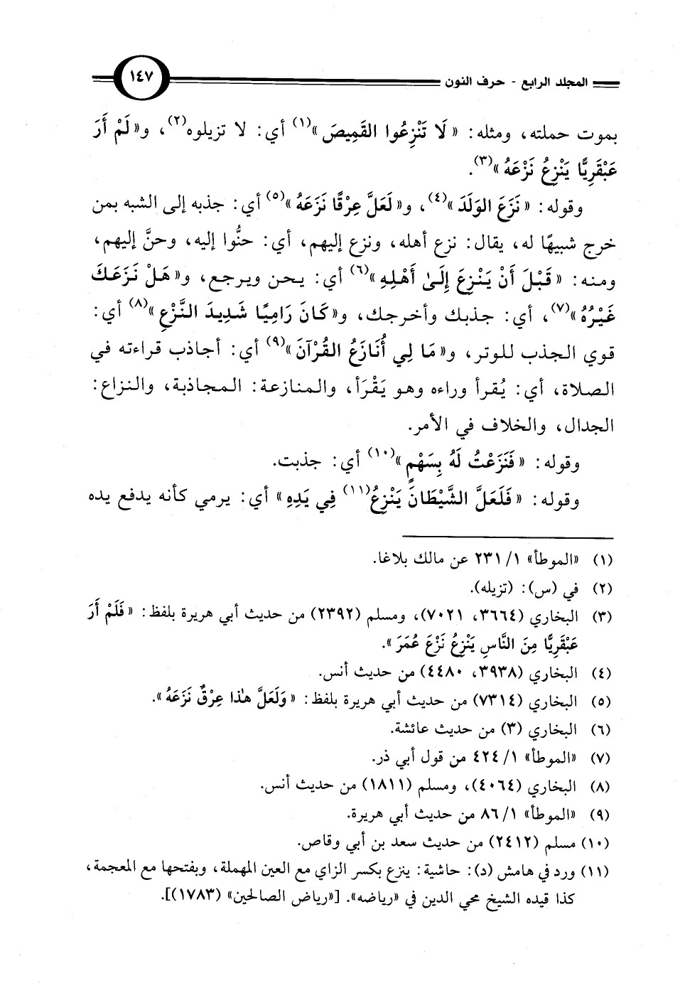 (¬11) ورد في هامش (د): حاشية: ينزع بكسر الزاي مع العين المهملة، وبفتحها مع المعجمة، كذا قيده الشيخ محي الدين في "رياضه". ["رياض الصالين " (1783)].