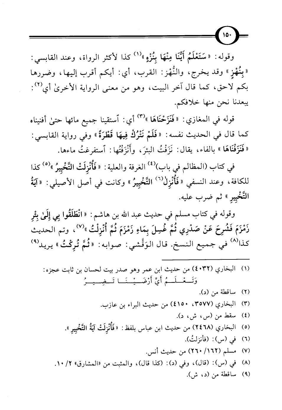 قوله في المغازي: "فَنَزَحْنَاهَا" (¬3) أي: استقينا جميع مائها حتى أفنيناه كما قال فى الحديث نفسه: "فَلَمْ نَتْرُكْ فِيهَا قَطْرَةً" وفي رواية القابسي: "فَنَزَفْنَاهَا" بالفاء، يقال: نَزَفْتُ البئرَ، وأَنْزَفْتُها: استفرغتُ ماءها.