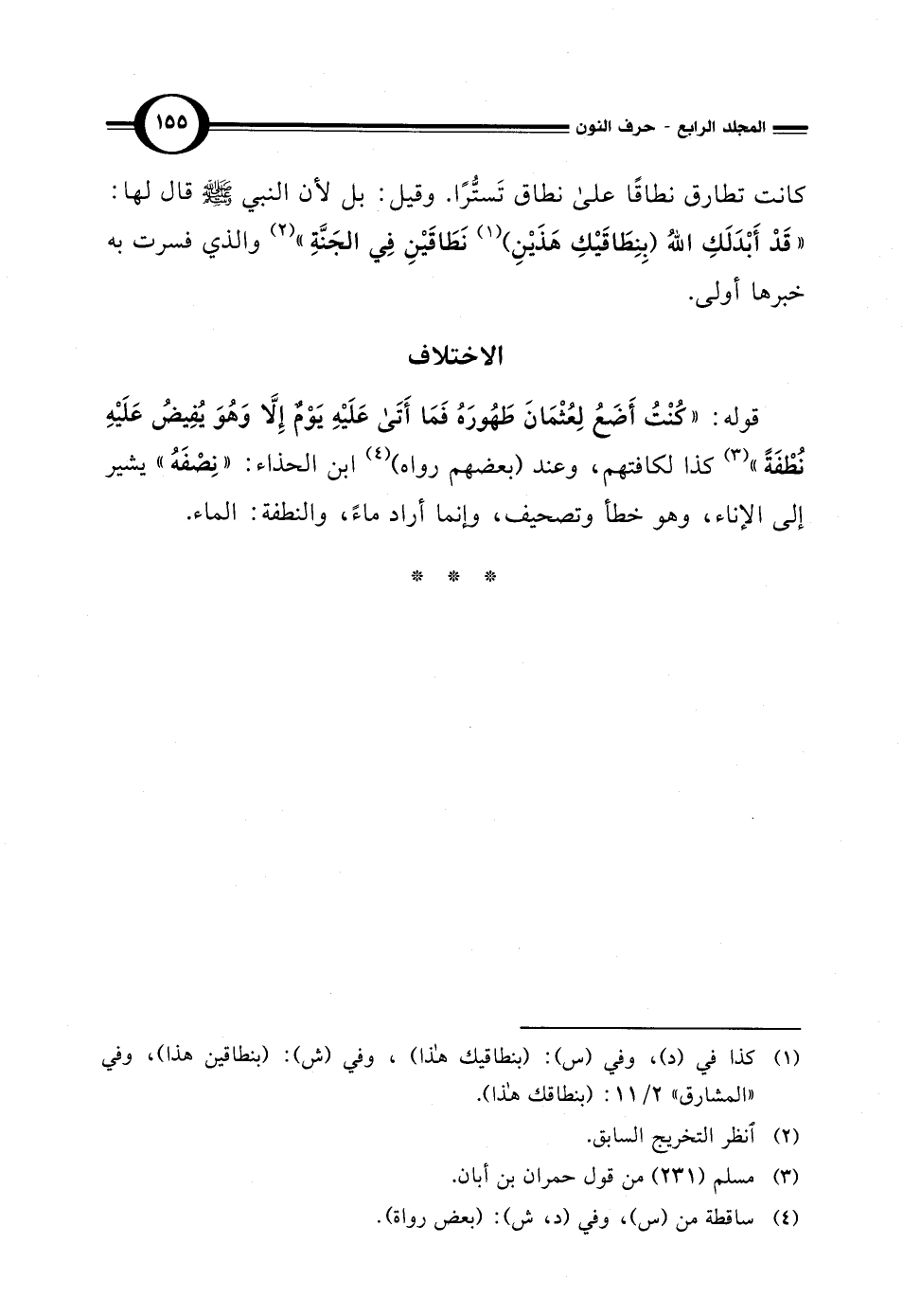 كانت تطارق نطاقًا على نطاق تَستُّرًا. وقيل: بل لأن النبي - صلى الله عليه وسلم - قال لها: "قَدْ أَبْدَلَكِ اللهُ (بِنِطَاقَيْكِ هَذَيْنِ) (¬1) نَطَاقَيْنِ في الجَنَّةِ" (¬2) والذي فسرت به خبرها أولى.