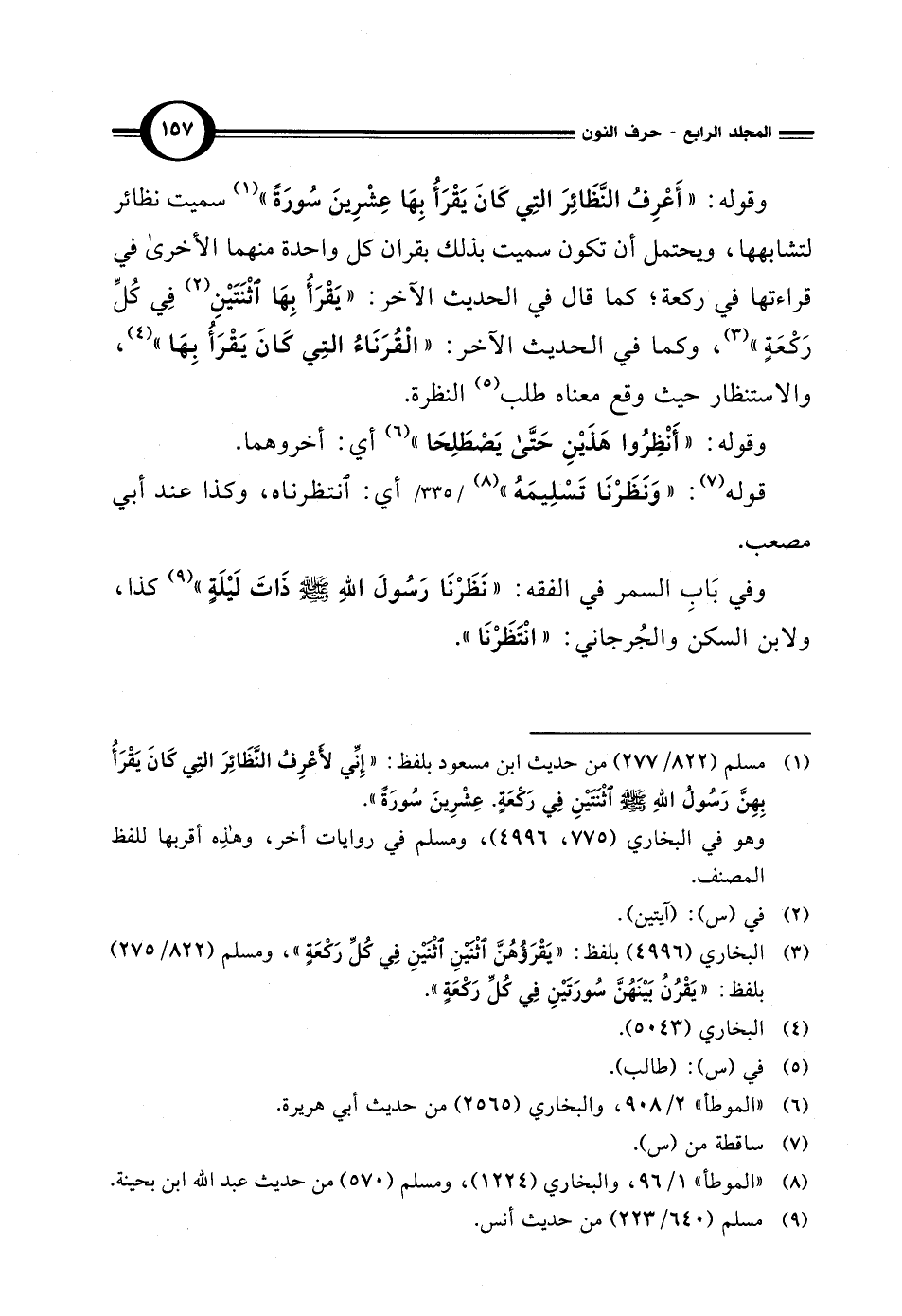 وقوله: "أَعْرِفُ النَّظَائِرَ التِي كَانَ يَقْرَأُ بِهَا عِشْرِينَ سُورَةً" (¬1) سميت نظائر لتشابهها، ويحتمل أن تكون سميت بذلك بقران كل واحدة منهما الأخرى في قراءتها في ركعة؛ كما قال فى الحديث الآخر: "يَقْرَأُ بِهَا اثْنَتَيْنِ (¬2) في كُلِّ رَكْعَة" (¬3)، وكما في الحديث الآخر: "الْقُرَنَاءُ التِي كَانَ يَقْرَأُ بِهَا" (¬4)، والاستنظار حيث وقع معناه طلب (¬5) النظرة.