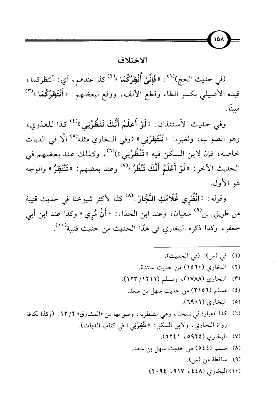 وفي حديث الاستئذان: "لَوْ أَعْلَمُ أَنَّكَ تَنْظُرُنِي" (¬4) كذا للعذري، وهو الصواب، ولغيره: "تَنْتَظِرُنِي" (وفي البخاري مثله (¬5) إلاَّ في الديات خاصة، فإن لابن السكن فيه "تَنْظُرُنِي") (¬6)، وكذلك عند بعضهم في الحديث الآخر: "لَوْ أَعْلَمُ أَنَّكَ تَنْظُرُ" (¬7) وعند بعضهم: "تَنْتَظِرُ" والوجه هو الأول.