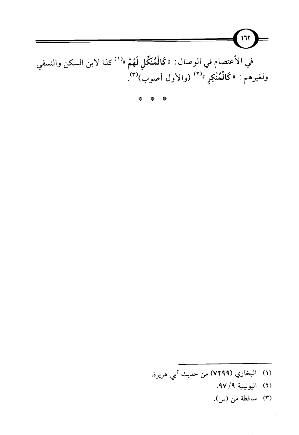 في الاعتصام في الوصال: "كَالْمُنَكِّلِ لَهُمْ" (¬1) كذا لابن السكن والنسفي ولغيرهم: "كَالْمُنْكِرِ" (¬2) (والأول أصوب) (¬3).