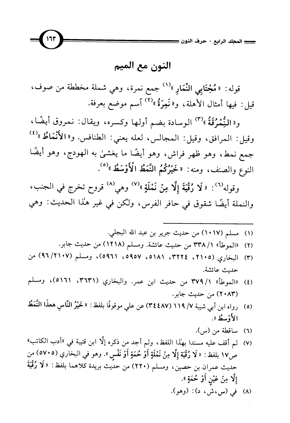 قوله: "مُجْتَابِي النِّمَارِ" (¬1) جمع نمرة، وهي شملة مخططة من صوف، قيل: فيها أمثال الأهلة، و"نَمِرَةُ" (¬2) اسم موضع بعرفة.