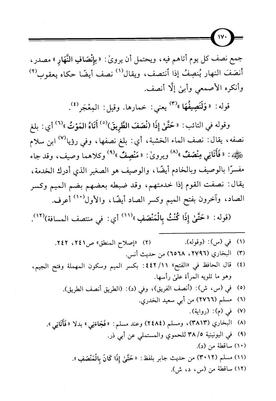 وقوله في التائب: "حَتَّى إِذَا (نْصَفَ الطَّرِيقَ) (¬5) أَتَاهُ المَوْتُ " (¬6) أي: بلغ نصفه، يقال: نصف الماء الخشبة، أي: بلغ نصفها، وفي رؤيا (¬7) ابن سلام - رضي الله عنه -: "فَأَتَانِي مِنْصَفٌ" (¬8) ويروى: "مَنْصِفٌ" (¬9) وكلاهما وصيف، وقد جاء مفسرًا بالوصيف وبالخادم أيضاً، والوصيف هو الصغير الذي أدرك الخدمة، يقال: نصفت القوم إذا خدمتهم، وقد ضبطه بعضهم بضم الميم وكسر الصاد، واَخرون بفتح الميم وكسر الصاد أيضاً، والأول (¬10) أعرف.