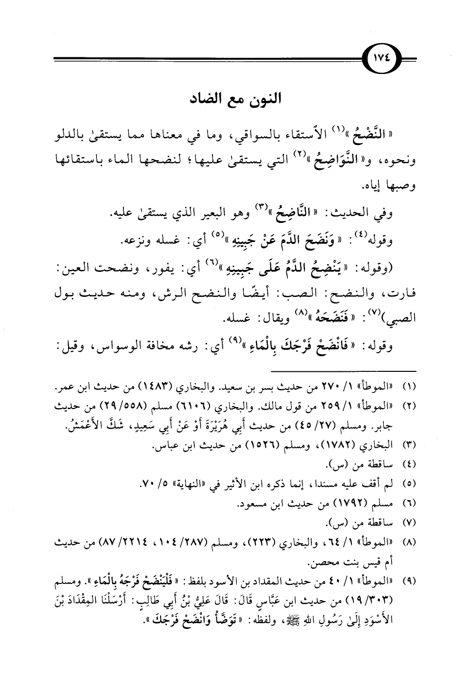 (¬9) "الموطأ" 1/ 40 من حديث المقداد بن الأسود بلفظ: "فَلْيَنْضَحْ فَرْجَهُ بِالْمَاءِ". ومسلم (303/ 19) من حديث ابن عَبَّاسٍ قَالَ: قَالَ عَلِيُّ بْنُ أَبِي طَالِبٍ: أَرْسَلْنَا المِقْدَادَ بْنَ الأَسْوَدِ إِلَى رَسُولِ اللهِ - صلى الله عليه وسلم -، ولفظه: "تَوَضَّأْ وَانْضَحْ فَرْجَكَ".