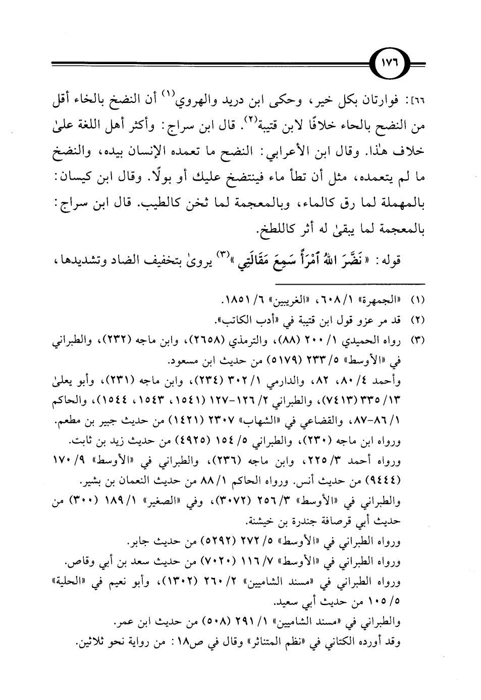 (¬3) رواه الحميدي 1/ 200 (88)، والترمذي (2658)، وابن ماجه (232)، والطبراني في "الأوسط" 5/ 233 (5179) من حديث ابن مسعود. وأحمد 4/ 80، 82، والدارمي 1/ 302 (234)، وابن ماجه (231)، وأبو يعلى 13/ 335 (7413)، والطبراني 2/ 126 - 127 (1541، 1543، 4451)، والحاكم 1/ 86 - 87، والقضاعي في "الشهاب" 2307 (1421) من حديث جبير بن مطعم. ورواه ابن ماجه (230)، والطبراني 5/ 154 (4925) من حديث زيد بن ثابت. ورواه أحمد 3/ 225، وابن ماجه (236)، والطبراني في "الأوسط" 9/ 170 (9444) من حديث أنس. ورواه الحاكم 1/ 88 من حديث النعمان بن بشير. والطبراني في "الأوسط" 3/ 256 (3072)، وفي "الصغير" 1/ 189 (300) من حديث أبي قرصافة جندرة بن خيشنة. ورواه الطبراني في "الأوسط" 5/ 272 (5292) من حديث جابر. ورواه الطبراني في "الأوسط" 7/ 116 (7020) من حديث سعد بن أبي وقاص. ورواه الطبراني في "مسند الشاميين" 2/ 260 (1302)، وأبو نعيم في "الحلية" 5/ 105 من حديث أبي سعيد. والطبراني في "مسند الشاميين" 1/ 291 (508) من حديث ابن عمر. وقد أورده الكتاني في "نظم المتناثر" وقال فى ص 18: من رواية نحو ثلاثين.