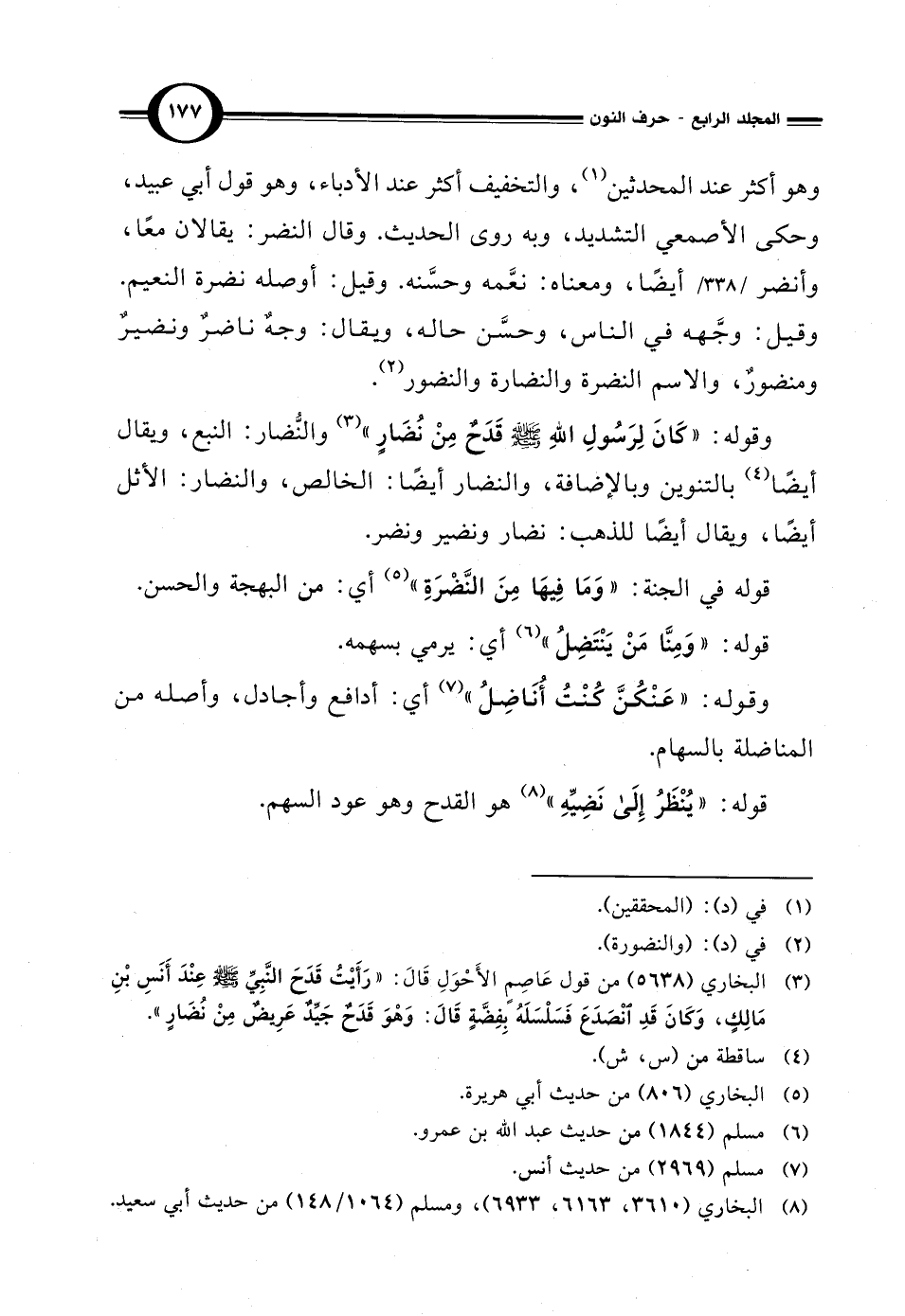 وقوله: "كَانَ لِرَسُولِ اللهِ - صلى الله عليه وسلم - قَدَحٌ مِنْ نُضَارٍ" (¬3) والنُّضار: النبع، ويقال أيضًا (¬4) بالتنوين وبالإضافة، والنضار أيضًا: الخالص، والنضار: الأثل أيضًا، ويقال أيضًا للذهب: نضار ونضير ونضر.