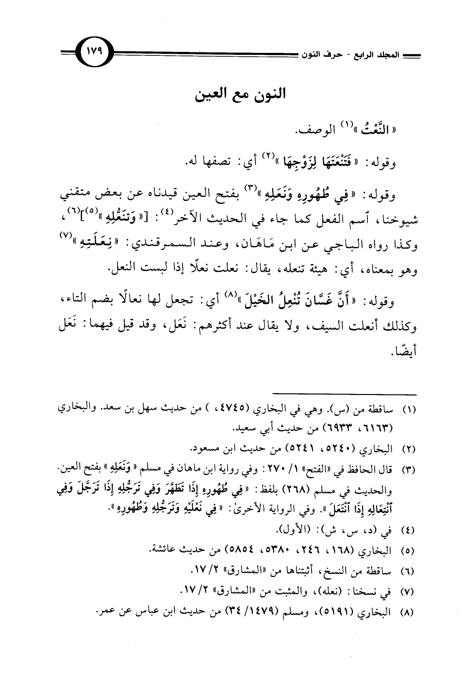 (¬3) قال الحافظ في "الفتح" 1/ 270: وفي رواية ابن ماهان في مسلم "وَنَعَلِهِ" بفتح العين. والحديث في مسلم (268) بلفظ: "في طُهُورِهِ إِذَا تَطَهَّرَ وَفِي تَرَجُّلِهِ إِذَا تَرَجَّلَ وَفِي انْتِعَالِهِ إِذَا انْتَعَلَ". وفي الرواية الأخرى: "في نَعْلَيْهِ وَتَرَجُّلِهِ وَطُهُورِهِ".
