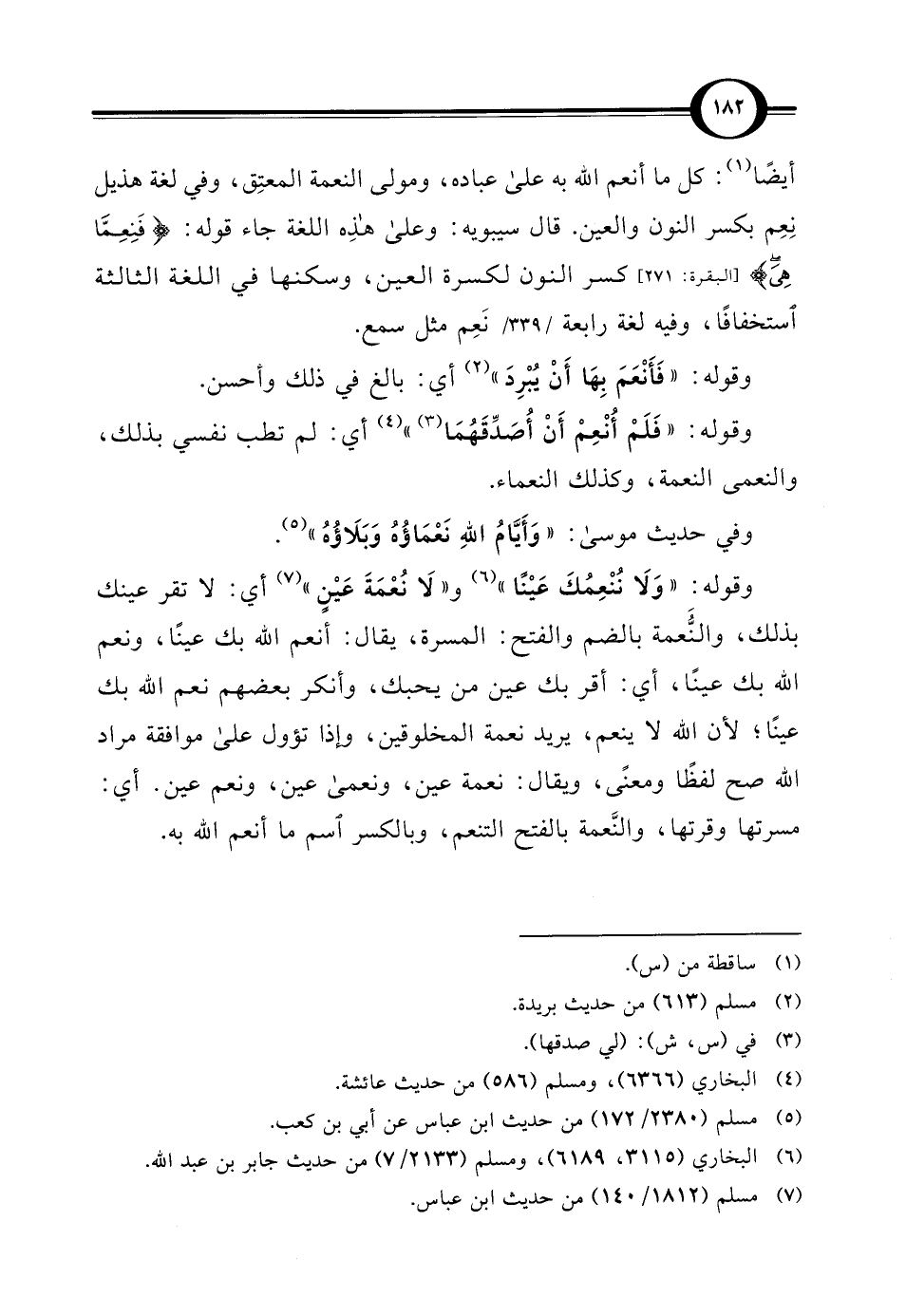 وقوله. "وَلَا نُنْعِمُكَ عَيْنًا (¬6) و"لَا نُعْمَةَ عَيْنٍ" (¬7) أي: لا تقر عينك بذلك، والنُّعمة بالضم والفتح: المسرة، يقال: أنعم الله بك عينًا، ونعم الله بك عينًا، أي: أقر بك عين من يحبك، وأنكر بعضهم نعم الله بك عينًا؛ لأن الله لا ينعم، يريد نعمة المخلوقين، وإذا تؤول على موافقة مراد الله صح لفظًا ومعنًى، ويقال: نعمة عين، ونعمى عين، ونعم عين. أي: مسرتها وقرتها، والنَّعمة بالفتح التنعم، وبالكسر اسم ما أنعم الله به.