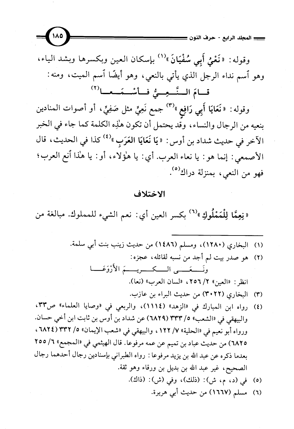 وقوله: "نَعَايَا أَبِي رَافِعٍ" (¬3) جمع نَعِيَّ مثل صَفِيٍّ، أو أصوات المنادين بنعيه من الرجال والنساء، وقد يحتمل أن تكون هذه الكلمة كما جاء في الخبر الآخر في حديث شداد بن أوس: "يَا نَعَايَا العَرَبِ" (¬4) كذا في الحديث، قال الأصمعي: إنما هو: يا نعاء العرب. أي: يا هؤلاء، أو: يا هذا انع العرب؛ فهو من النعي، بمنزلة دراك (¬5).