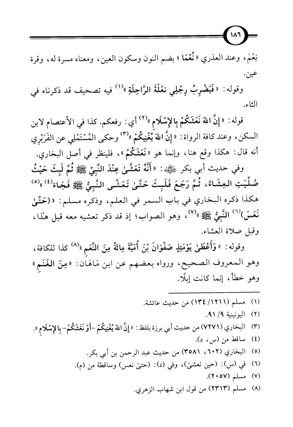 وفي حديث أبي بكر - رضي الله عنه -: "أَنَّهُ تَعَشَّى عِنْدَ النَّبِيِّ - صلى الله عليه وسلم - ثُمَّ لَبِثَ حَيثُ صُلِّيَتِ العِشَاءُ، ثُمَّ رَجَعَ فَلَبِثَ حَتَّى تَعَشَّى النَّبِيُّ - صلى الله عليه وسلم - فَجَاءَ (¬4) " (¬5) هكذا ذكره البخاري في باب السمر في العلم، وذكره مسلم: " (حَتَّى نَعَسَ) (¬6) النَّبِيُّ - صلى الله عليه وسلم -" (¬7)، وهو الصواب؛ إذ قد ذكر تعشيه معه قبل هذا، وقبل صلاة العشاء.