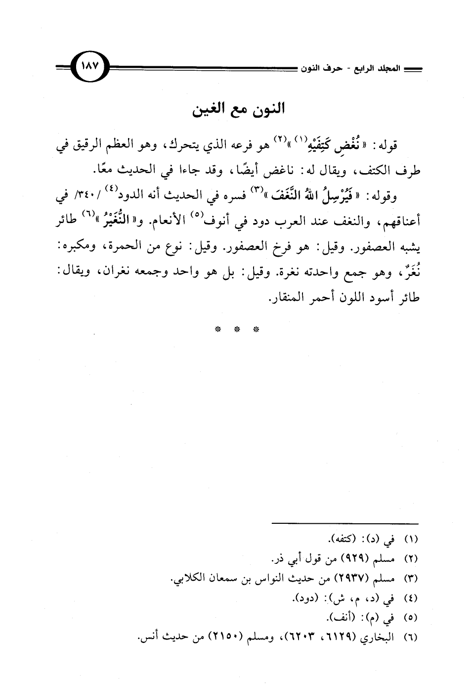 وقوله: "فَيُرْسِلُ اللهُ النَّغَفَ" (¬3) فسره في الحديث أنه الدود (¬4) في أعناقهم، والنغف عند العرب دود في أنوف (¬5) الأنعام. و"النُّغَيْرُ" (¬6) طائر يشبه العصفور. وقيل: هو فرخ العصفور. وقيل: نوع من الحمرة، ومكبره: نُغَرٌ، وهو جمع واحدته نغرة. وقيل: بل هو واحد وجمعه نغران، ويقال: طائر أسود اللون أحمر المنقار.