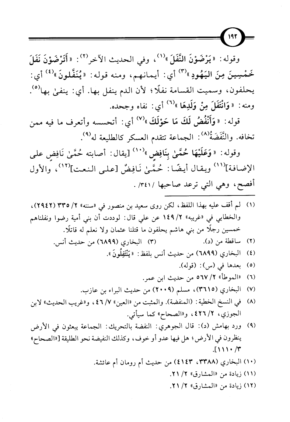 (¬9) ورد بهامش (د): قال الجوهري: النفضة بالتحريك: الجماعة يبعثون في الأرض ينظرون في الأرض؛ هل فيها عدو أو خوف، وكذلك النفيضة نحو الطليقة ["الصحاح" 3/ 1110".
