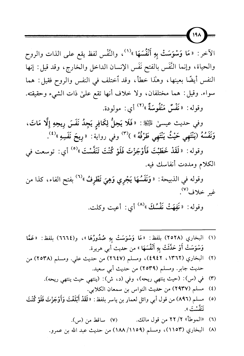 الآخر: "مَا وَسْوَسَتْ بِهِ أَنْفُسَهَا" (¬1)، والنَّفْس لفظ يقع على الذات والروح والحياة، وإنما النَّفَس بالفتح نَفَس الإنسان الداخل والخارج، وقد قيل: إنها النفس أيضًا بعينها، وهذا خطأ، وقد اختلف في النفس والروح فقيل: هما سواء. وقيل: هما مختلفان، ولا خلاف أنها تقع على ذات الشيء وحقيقته.