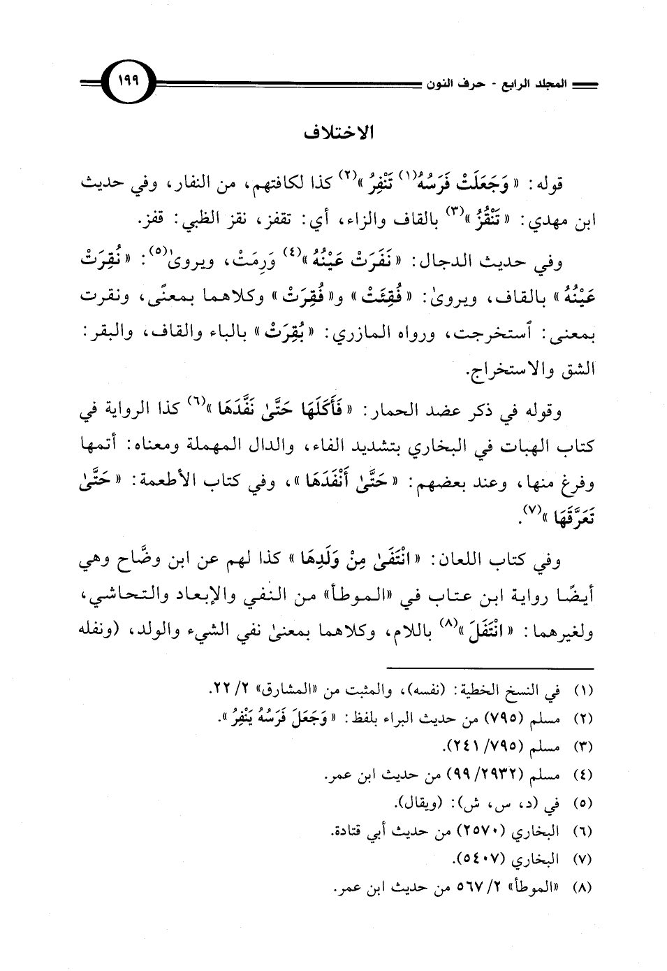 وفي حديث الدجال: "نَفَرَتْ عَيْنُهُ" (¬4) وَرِمَتْ، ويروى (¬5): "نُقِرَتْ عَيْنُهُ" بالقاف، ويروا: "فُقِئَتْ" و"فُقِرَتْ" وكلاهما بمعنًى، ونقرت بمعنى: استخرجت، ورواه المازري: "بُقِرَتْ" بالباء والقاف، والبقر: الشق والاستخراج.