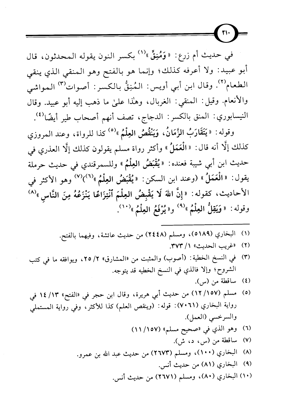 (¬5) مسلم (157/ 12) من حديث أبي هريرة، وقال ابن حجر في "الفتح" 13/ 14 في رواية البخاري (7061): قوله: (وينقص العلم) كذا للأكثر، وفي رواية المستملي والسرخسي (العمل).