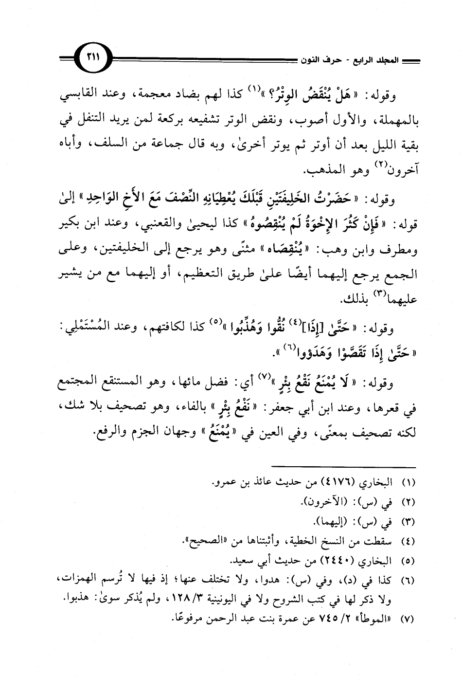 وقوله: "هَلْ يُنْقَضُ الوِتْرُ؟ " (¬1) كذا لهم بضاد معجمة، وعند القابسي بالمهملة، والأول أصوب، ونقض الوتر تشفيعه بركعة لمن يريد التنفل في بقية الليل بعد أن أوتر ثم يوتر أخرى، وبه قال جماعة من السلف، وأباه آخرون (¬2) وهو المذهب.