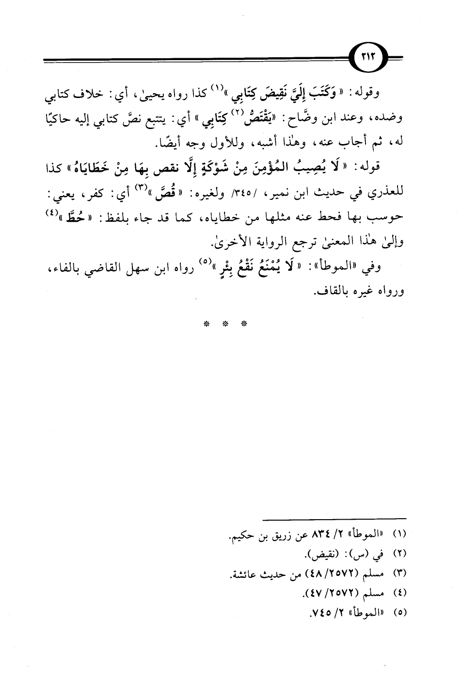 قوله: "لَا يُصِيبُ المُؤْمِنَ مِنْ شَوْكَةٍ إِلَّا نقص بِهَا مِنْ خَطَايَاهُ" كذا للعذري في حديث ابن نُمير، ولغيره: "قُصَّ" (¬3) أي: كفر، يعني: حوسب بها فحط عنه مثلها من خطاياه، كما قدجاء بلفظ: "حُطَّ" (¬4) وإلى هذا المعنى ترجع الرواية الأخرى.