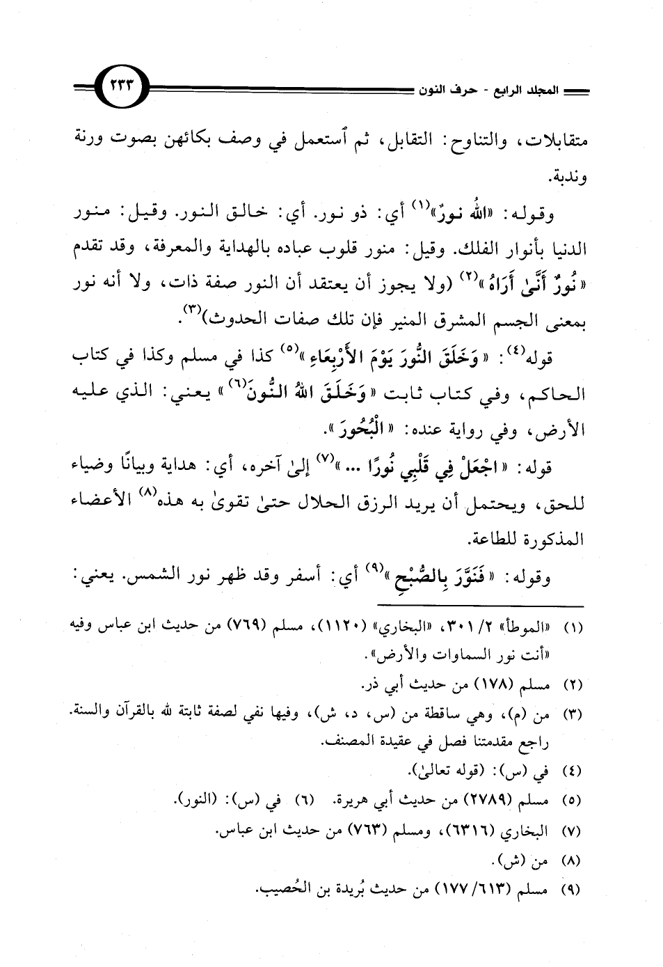 وقوله: "اللهُ نورٌ" (¬1) أي: ذو نور. أي: خالق النور. وقيل: منور الدنيا بأنوار الفلك. وقيل: منور قلوب عباده بالهداية والمعرفة، وقد تقدم "نُورٌ أَنَّى أَرَاهُ" (¬2) (ولا يجوز أن يعتقد أن النور صفة ذات، ولا أنه نور بمعنى الجسم المشرق المنير فإن تلك صفات الحدوث) (¬3).