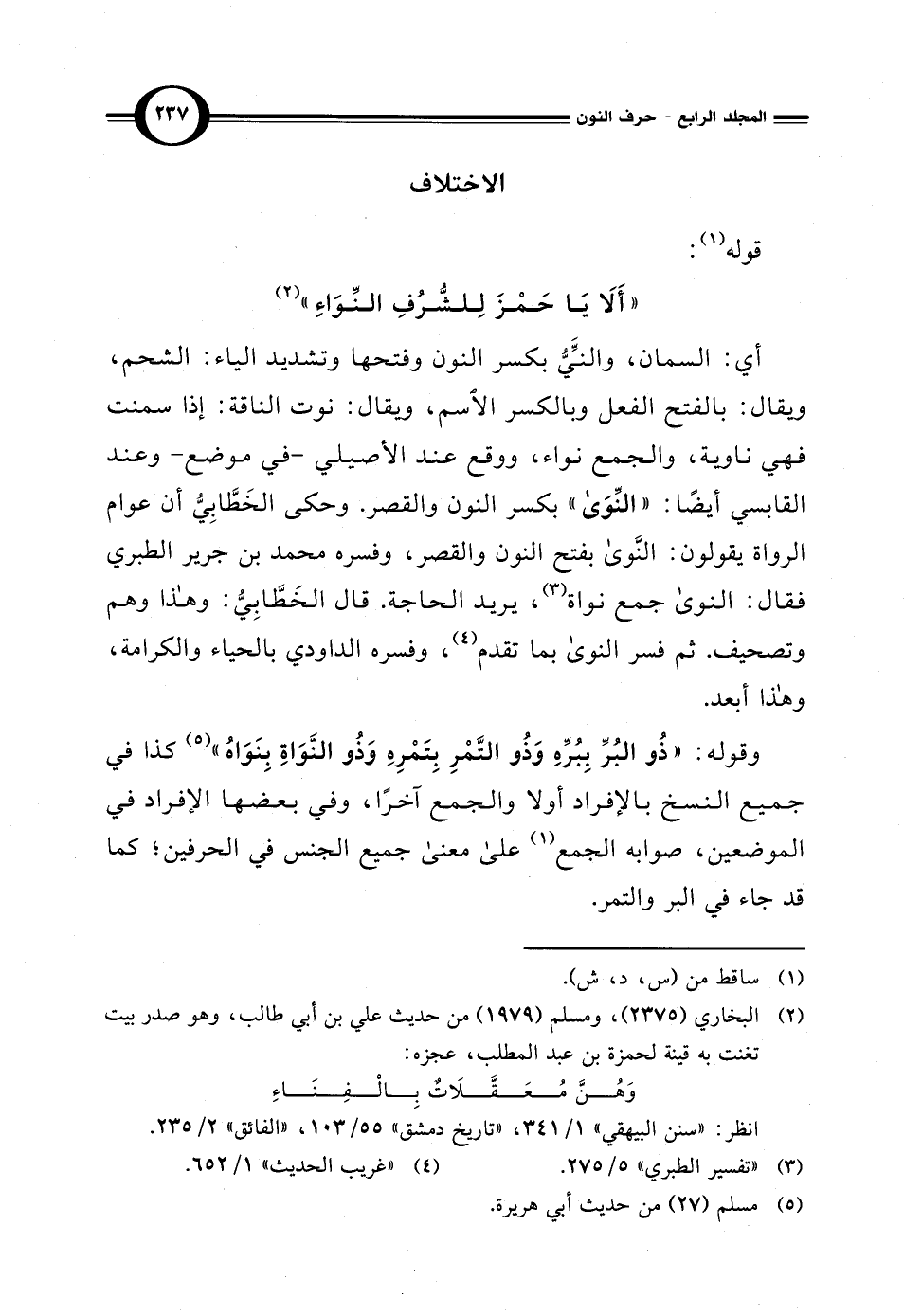 أي: السمان، والنِّيُّ بكسر النون وفتحها وتشديد الياء: الشحم، ويقال: بالفتح الفعل وبالكسر الاسم، ويقال: نوت الناقة: إذا سمنت فهي ناوية، والجمع نواء، ووقع عند الأصيلي - في موضع - وعند القابسي أيضًا: "النِّوَى" بكسر النون والقصر. وحكى الخَطَّابِيُّ أن عوام الرواة يقولون: النَّوى بفتح النون والقصر، وفسره محمد بن جرير الطبري فقال: النوى جمع نواة (¬3)، يريد الحاجة. قال الخَطَّابِيُّ: وهذا وهم وتصحيف. ثم فسر النوى بما تقدم (¬4)، وفسره الداودي بالحياء والكرامة، وهذا أبعد.